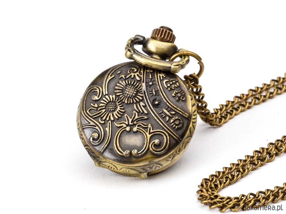 Maleńki zegarek o otwieranym sprężynowo-ażurowym wieczku z motywem motyla i kokardy dodającej minimalnej asymetrii do tego bardzo klasycznego wzoru. Pod wyobrażeniem pyszniącego się swą urodą motyla odnajdziecie Państwo schludnie wykonaną, wyrazistą tarczę koloru kremowego, na której wyraźnym kontrastem odcinają się arabskie cyfry i czarne wskazówki. Zegarek wykonany jest z brązu; wyposażony w odporne na zarysowania szkiełko i niezawodny, japoński mechanizm kwarcowy. Adresowany jest zdecydowanie do tych, które potrafią podkreślać swą kobiecość, zwłaszcza w jej tajemniczych i dynamicznych aspektach.