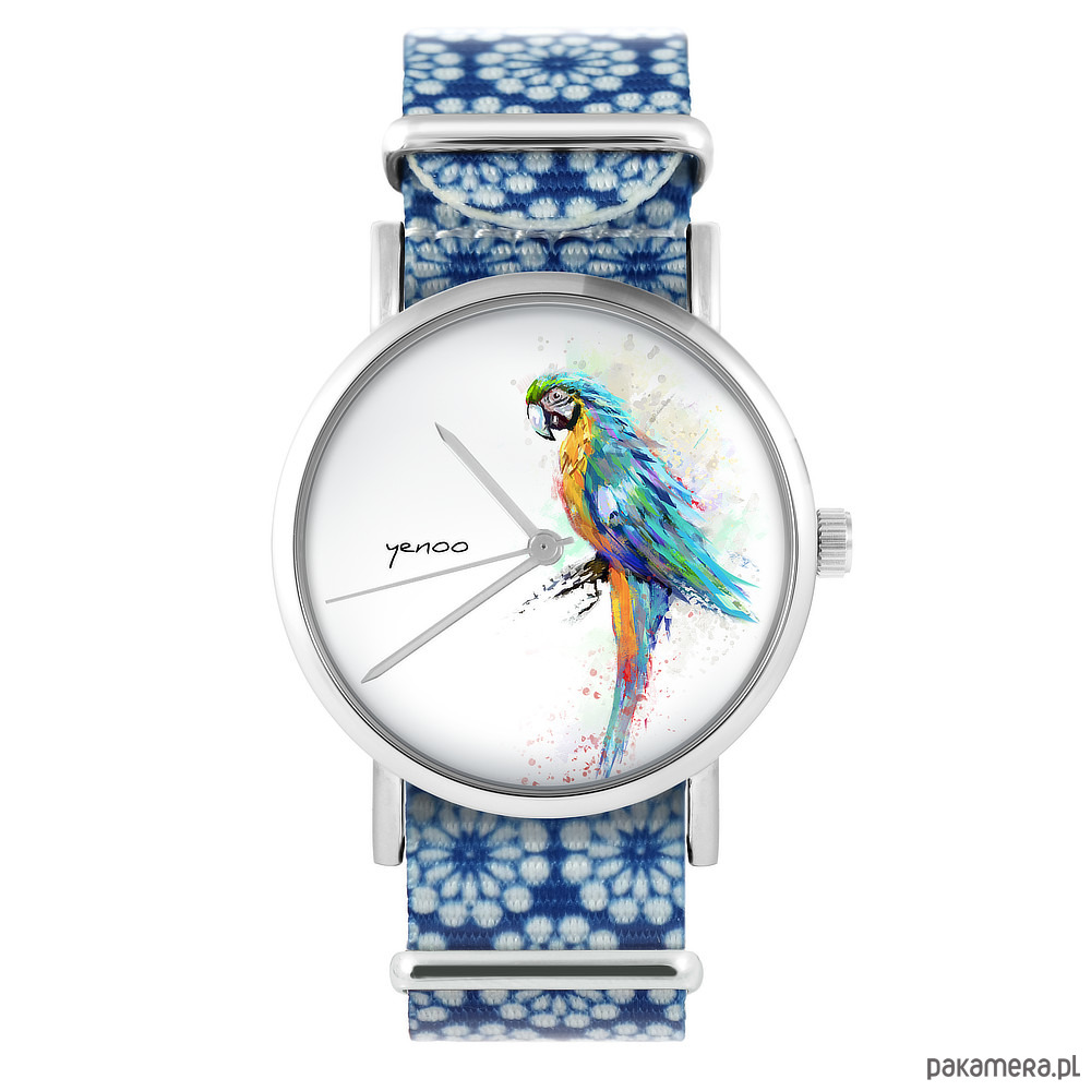 Zegarek - Papuga turkusowa - niebieski, kwiaty