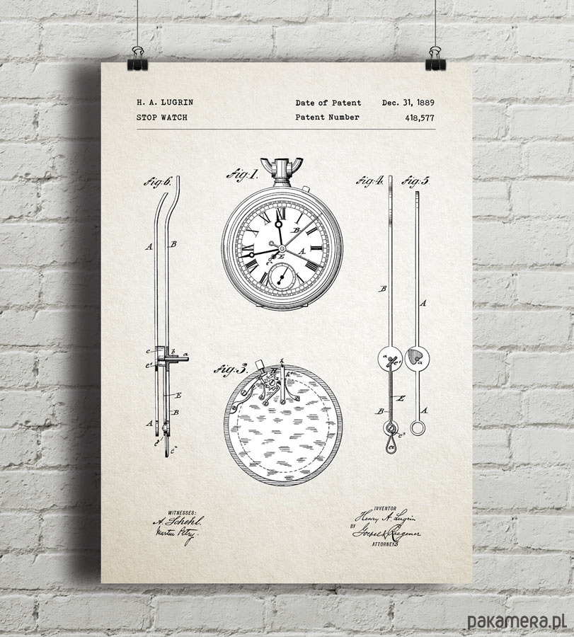 Plakat z reprodukcją patentu na zegarek kieszonkowy, autorstwa H. A. Lugrina. Patent o numerze 418577 został udzielony w 1889 roku przez Urząd Patentów i Znaków Towarowych Stanów Zjednoczonych.