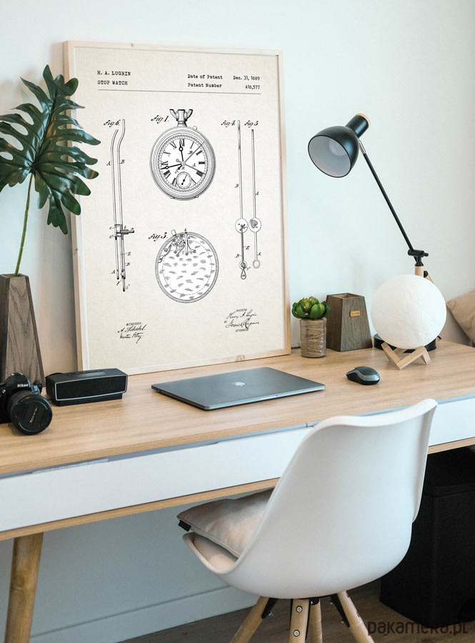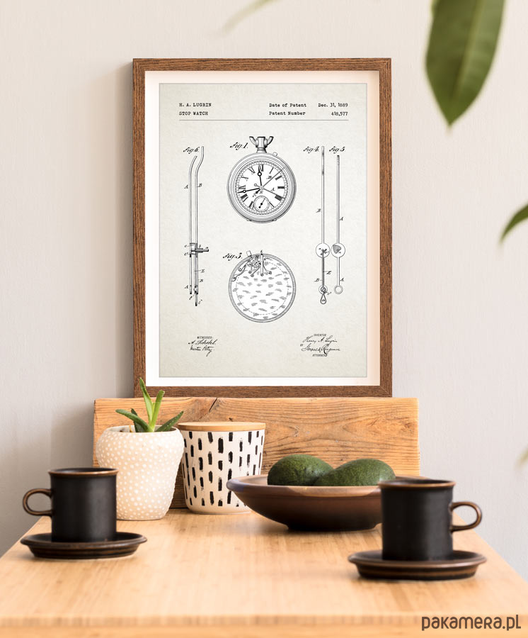Plakat z reprodukcją patentu na zegarek kieszonkowy, autorstwa H. A. Lugrina. Patent o numerze 418577 został udzielony w 1889 roku przez Urząd Patentów i Znaków Towarowych Stanów Zjednoczonych.