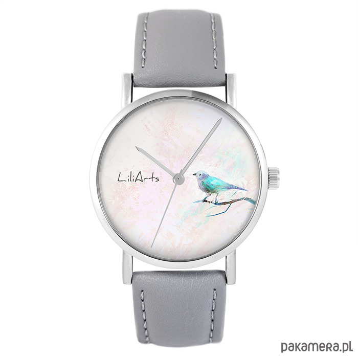 Zegarek - Ptaszek turkusowy - skóra, szary