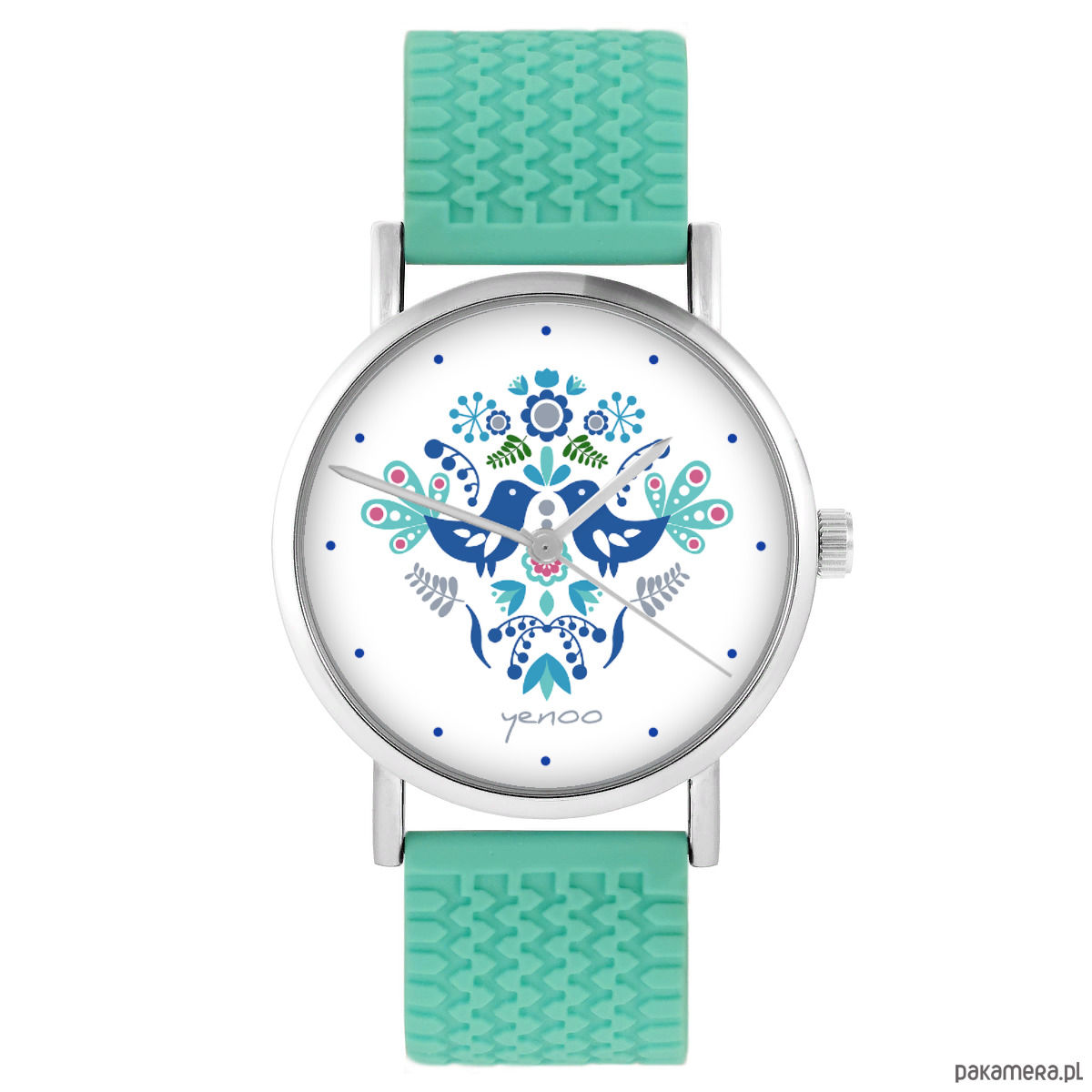 Zegarek - Ptaszki folkowe, blue - silikonowy, turkus