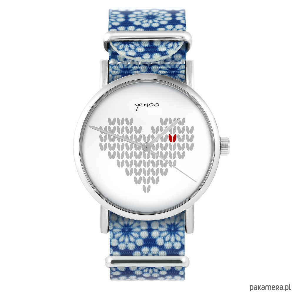 Zegarek - Serce dziergane - niebieski, kwiaty