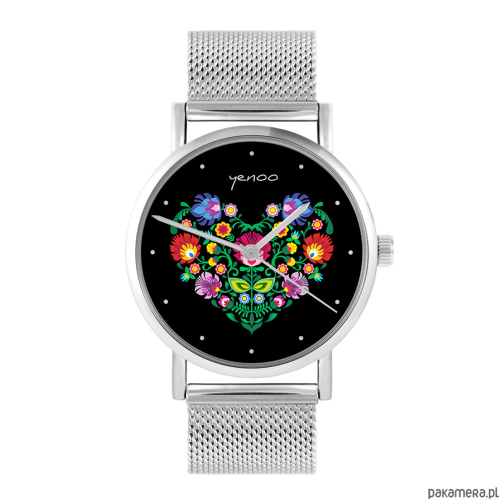 Zegarek - Serce folk, czarne - bransoleta mesh