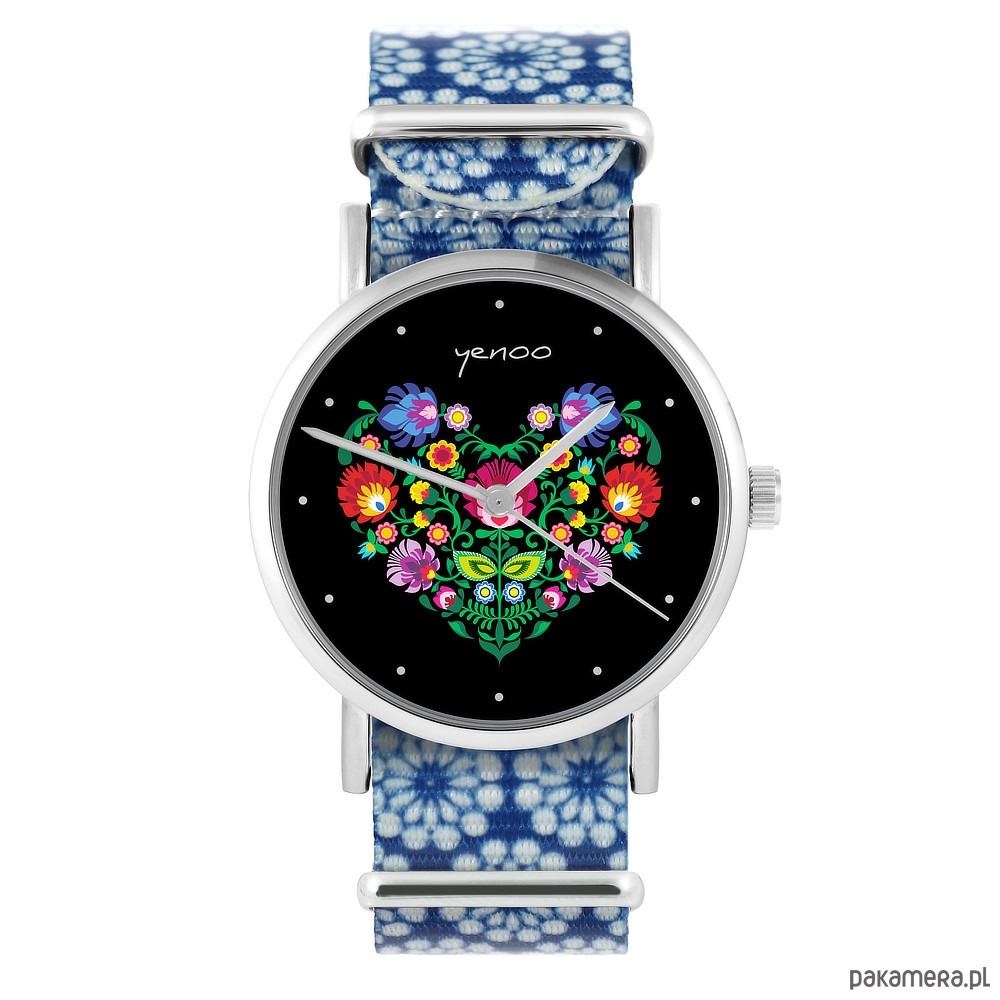 Zegarek - Serce folk czarne - niebieski, kwiaty