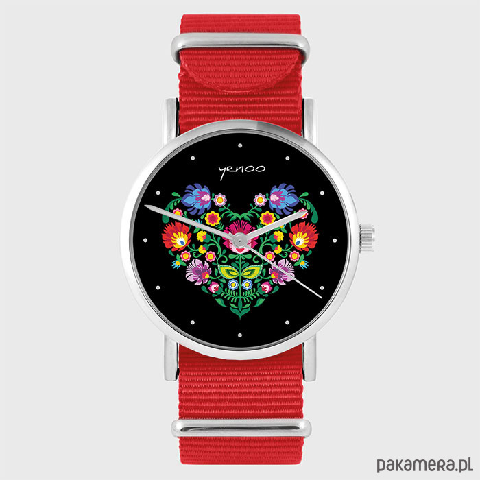 Zegarek - Serce folk, czarny - czerwony, nato