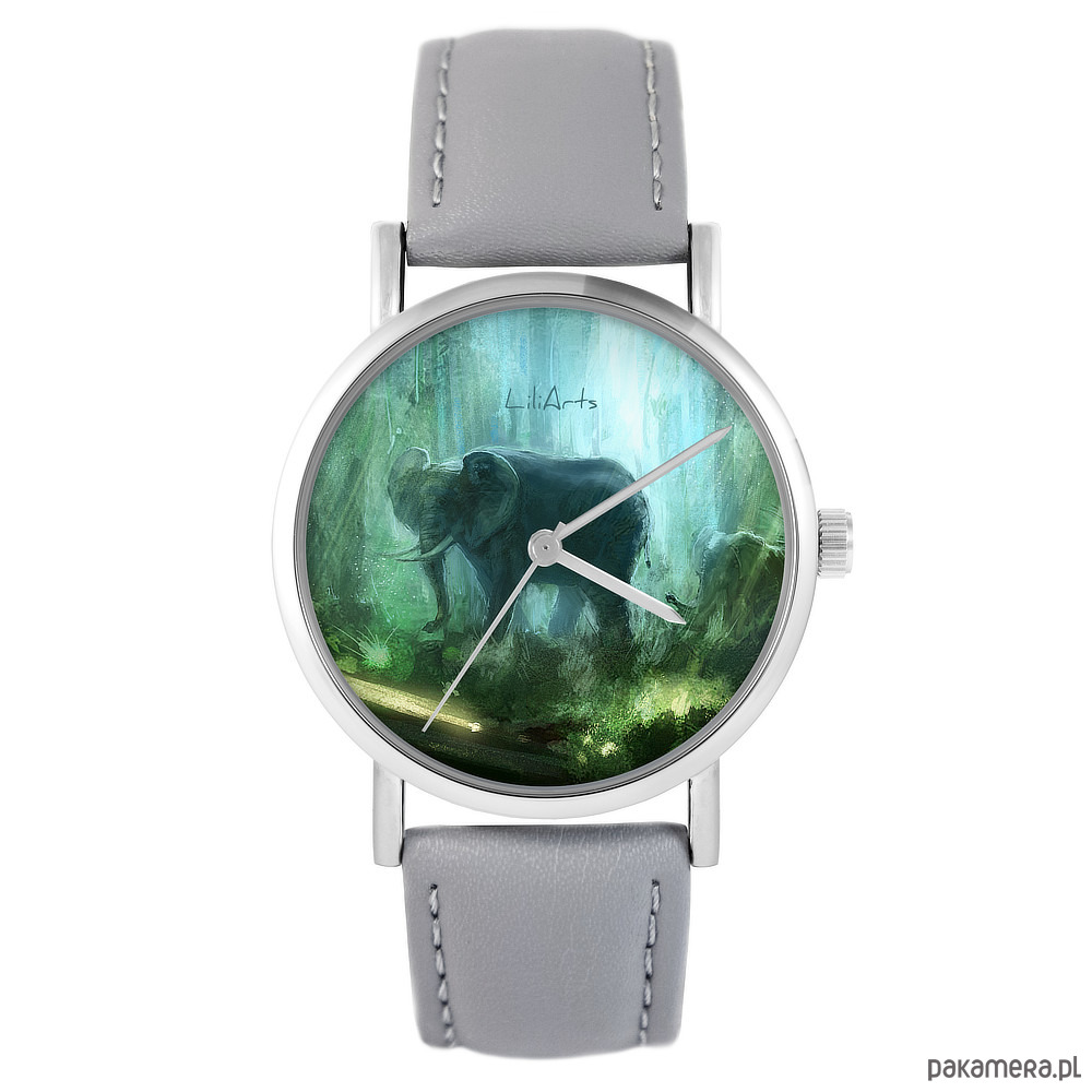 Zegarek - Słoń, dżungla - skóra, szary