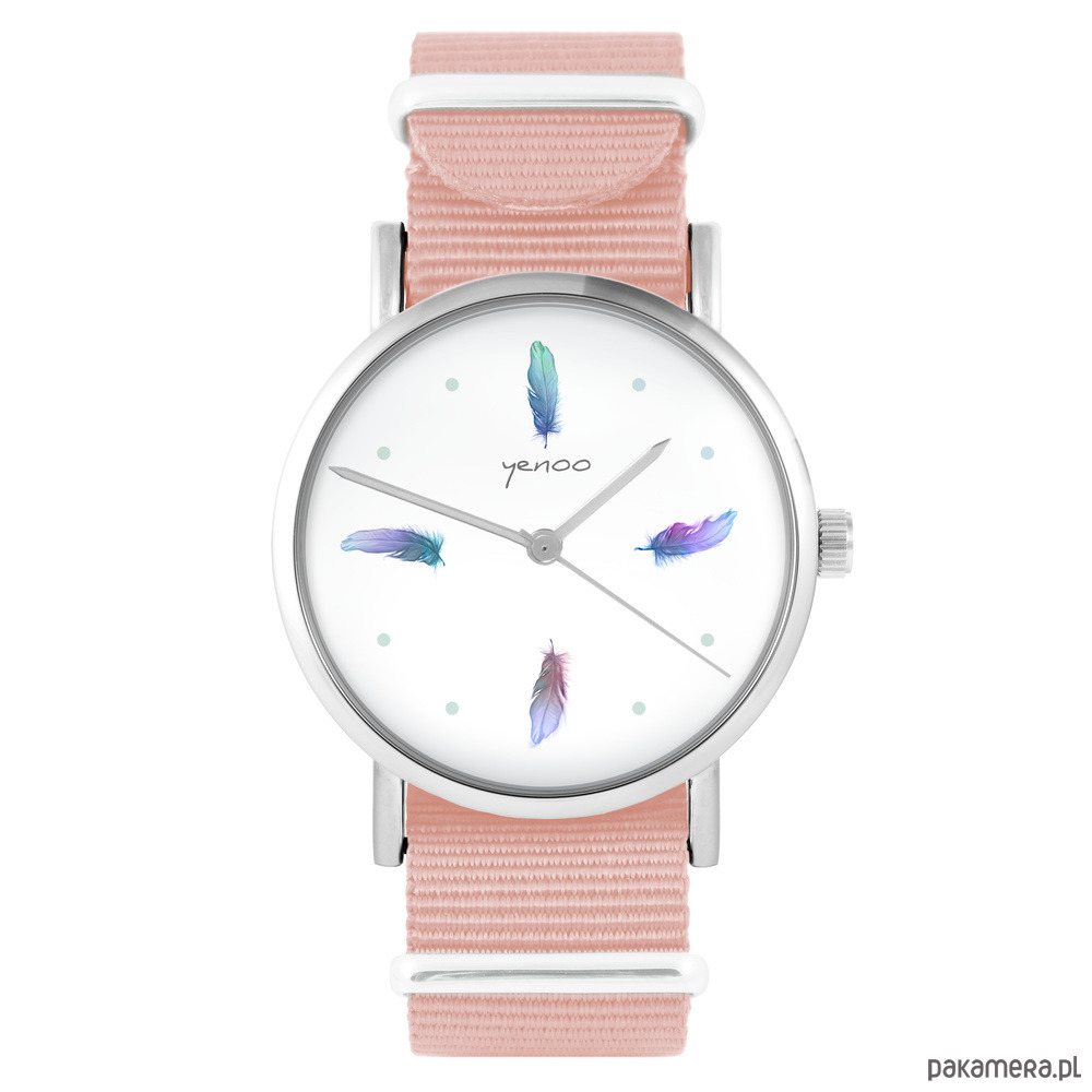 Zegarek - Turkusowe piórka - brzoskwiniowy róż