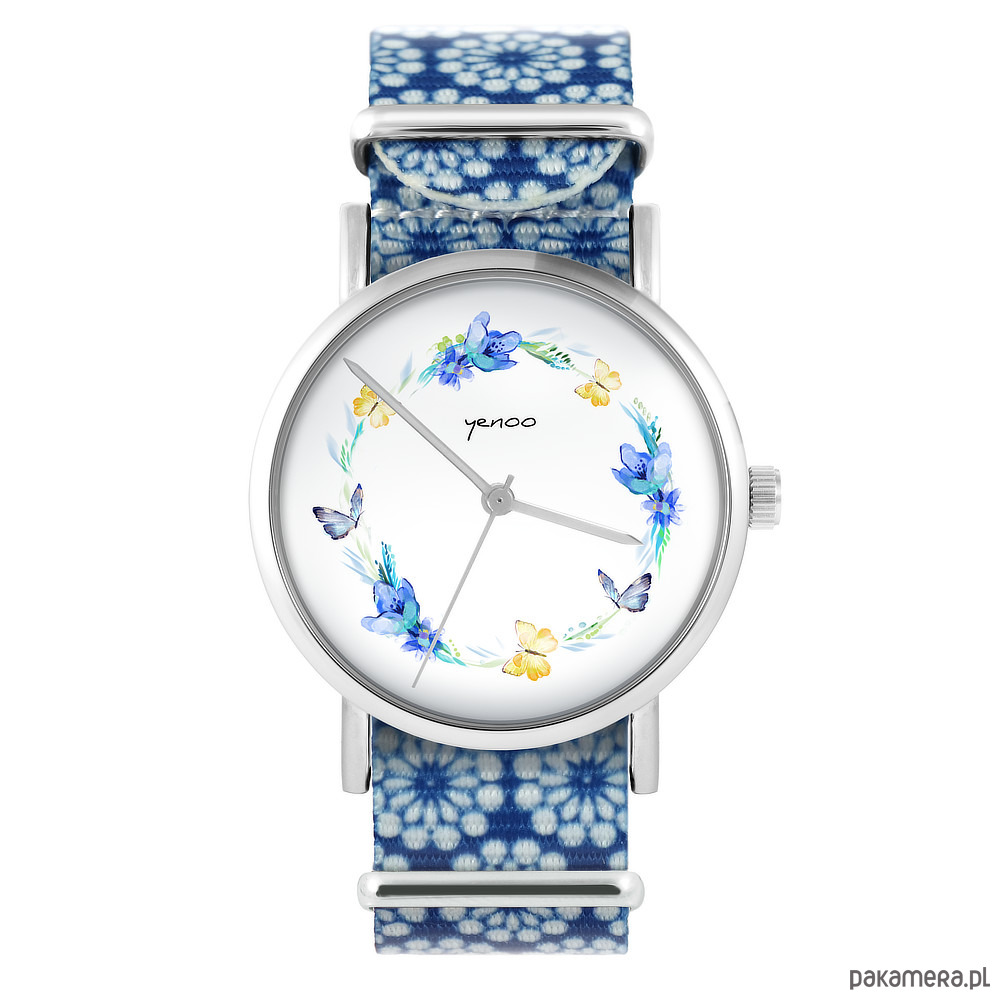 Zegarek - Wianek, motyle - niebieski, kwiaty