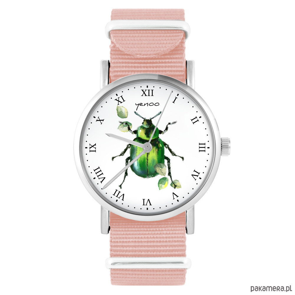 Zegarek - Zielony żuczek - brzoskwiniowy róż