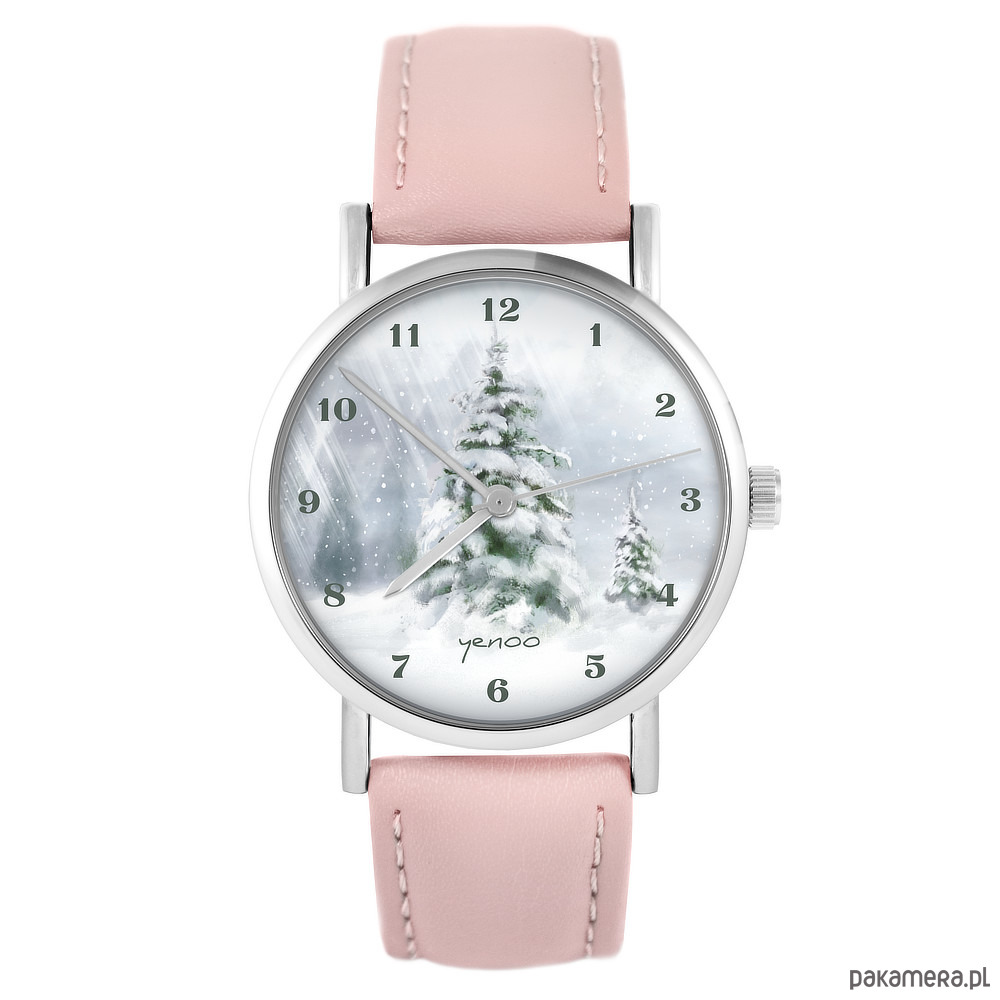 Zegarek - Zimowy, choinka - pudrowy róż, skóra