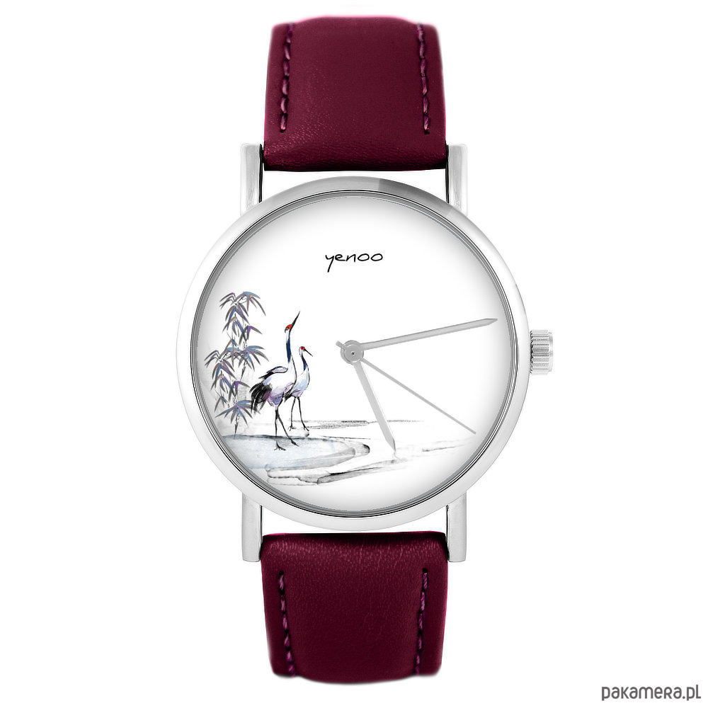 Zegarek - Żurawie sumi-e - skórzany, burgund