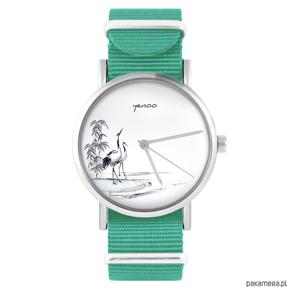 Zegarek - Żurawie sumi-e - turkusowy, nylonowy