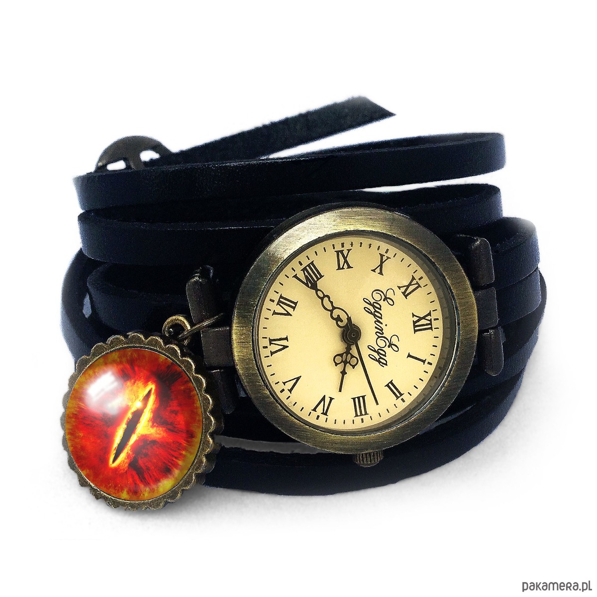 Bardzo dobrej jakości zegarek ze skórzanym paskiem, trzykrotnie zakręcany na ręku z ręcznie robioną zawieszką (kaboszonem). Do kompletu można dokupić medalion, kolczyki, pierścionek. Zegarek-bransoletka składa się z: - zegarka (tarcza zegarka o średnicy 2,5 cm), - skórzanego paska w czarnym kolorze, - kaboszonu z grafiką o średnicy 16 mm. Grafika prezentowana na dowieszce może być doczepiona do każdego zegarka z paskiem w kolorze aktualnie dostępnym w ofercie naszego butiku. Na życzenie możemy wykonać zawieszkę z jakąkolwiek grafiką (dostępną na naszych innych produktach lub na życzenie klienta). Każdy produkt pakowany jest w eleganckie pudełeczko. Produkt nie jest wodoodporny.