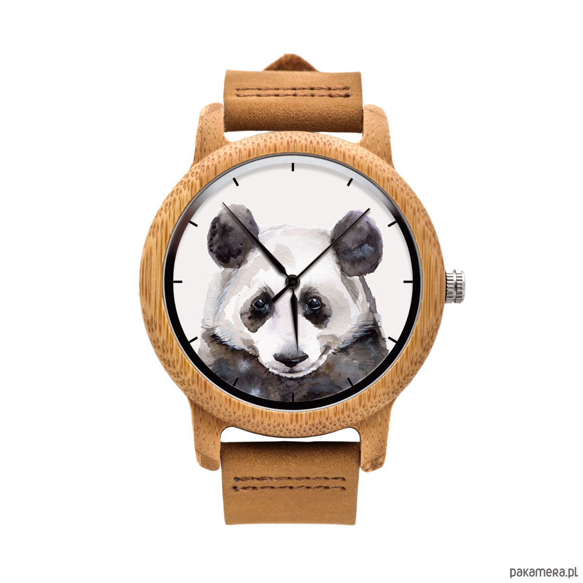 Stylowy zegarek na skórzanym pasku wykonany z drewna z wysokiej jakości grafiką na tarczy.