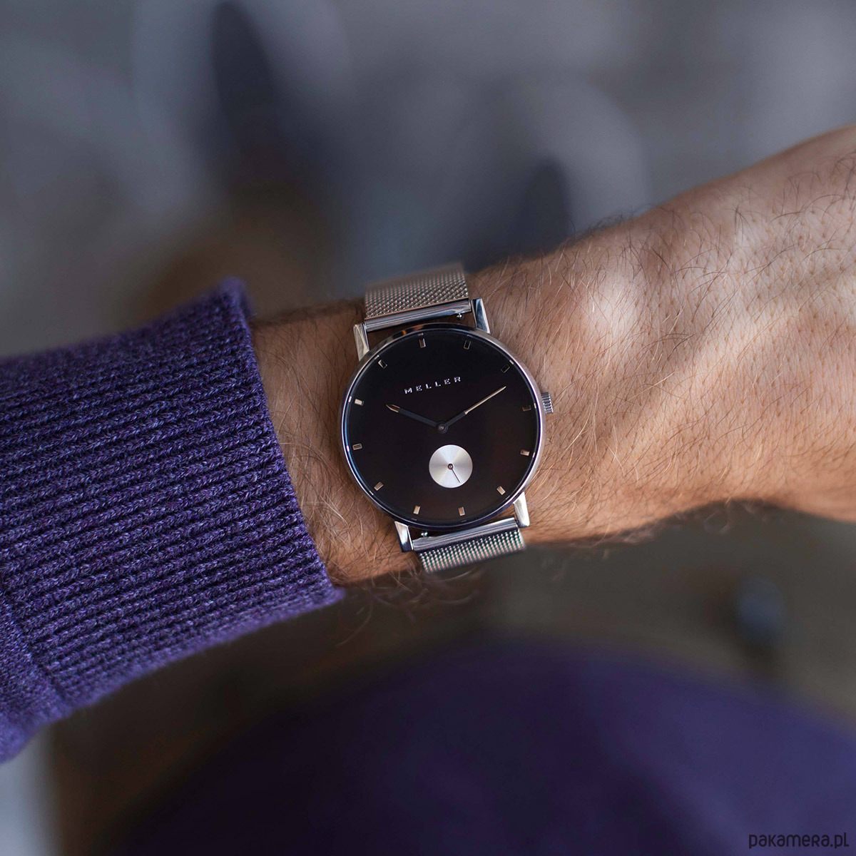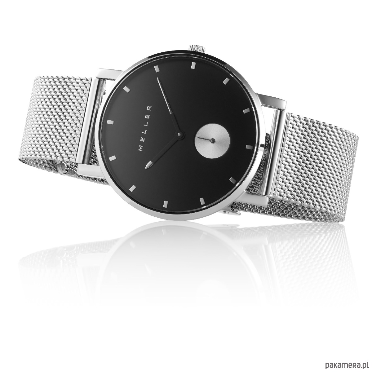 Zegarek Meller Maori Black Silver posiada srebrną kopertę o szerokości 38 mm, która w połączeniu z czarną tarczą oraz srebrną bransoletą nadają zegarkowi stylu. Indeksy godzinowe w srebrnym kolorze ułatwiają odczytywanie godziny, a mały sekundnik umieszczony w dolnej części tarczy to ciekawy detal. Minimalistyczne logo Meller na tarczy oraz na koronce dodają charakteru.