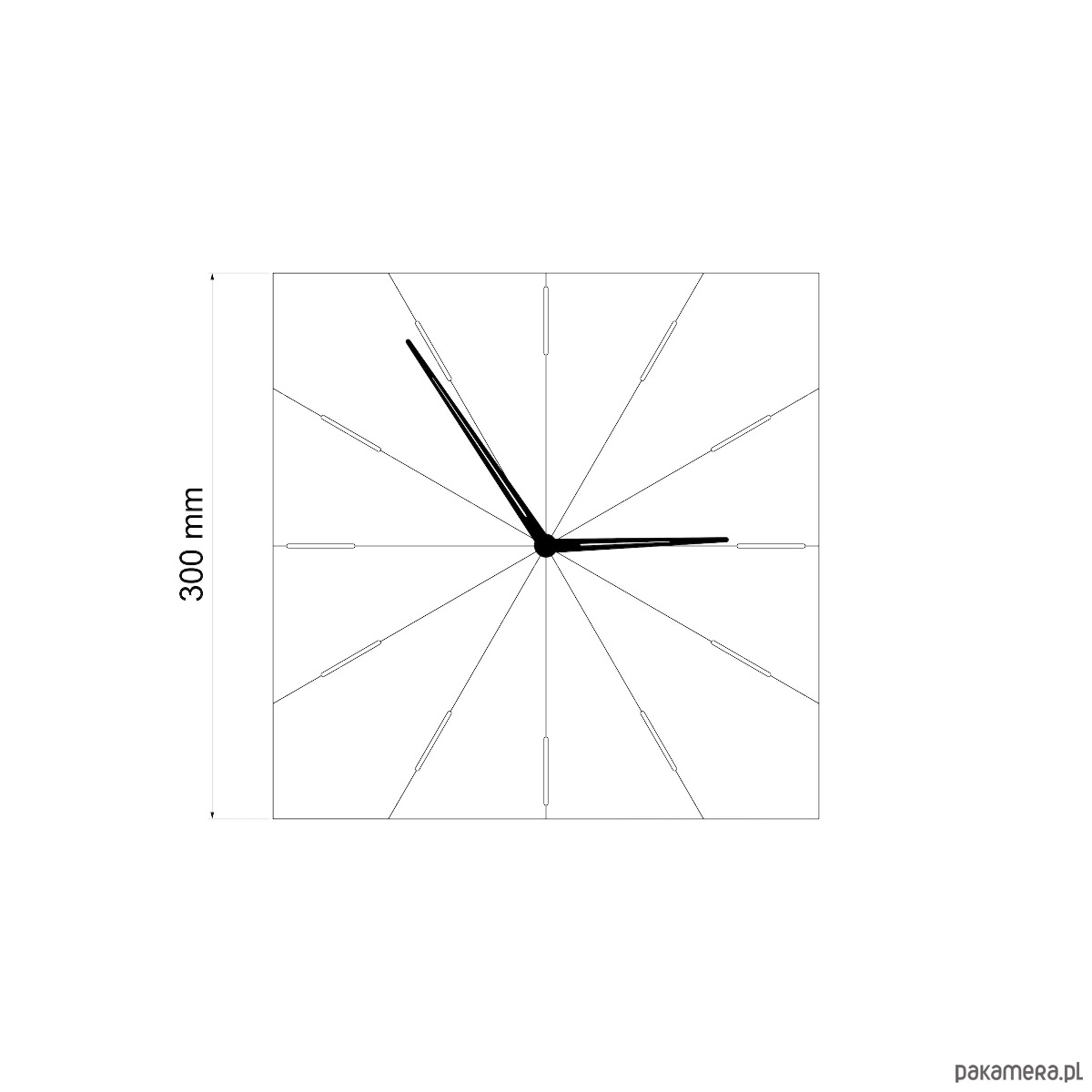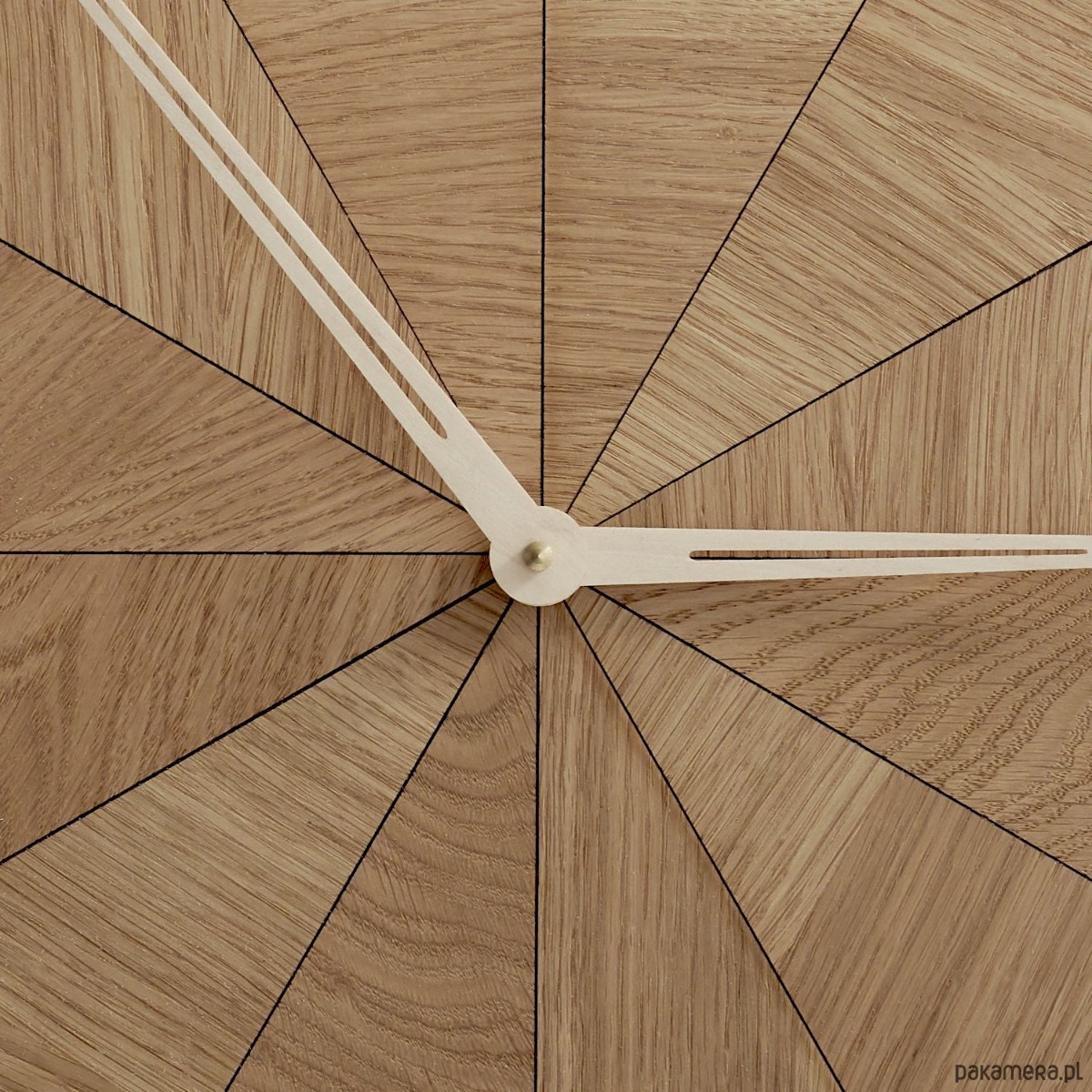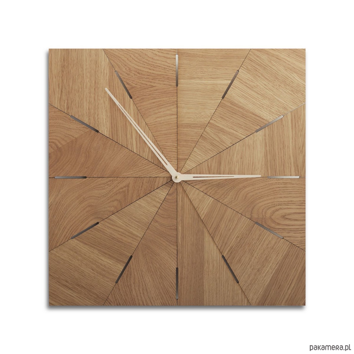 Duży zegar ścienny kwadratowy. Tarcza zegara podzielona jest na dwanaście części przy czym ułożenie słojów drewna na każdej części jest w innym kierunku. Nadaje to zegarowi subtelny dynamiczny charakter. Godziny są oznaczone wąskimi szczelinami. Specjalnie zaprojektowane smukłe wskazówki wykonane są ze sklejki i dostępne są dwóch kolorach: naturalnej brzozy lub ciemnobrązowym.