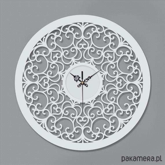 Drewniany ażurowy zegar ścienny o finezyjnym motywie.