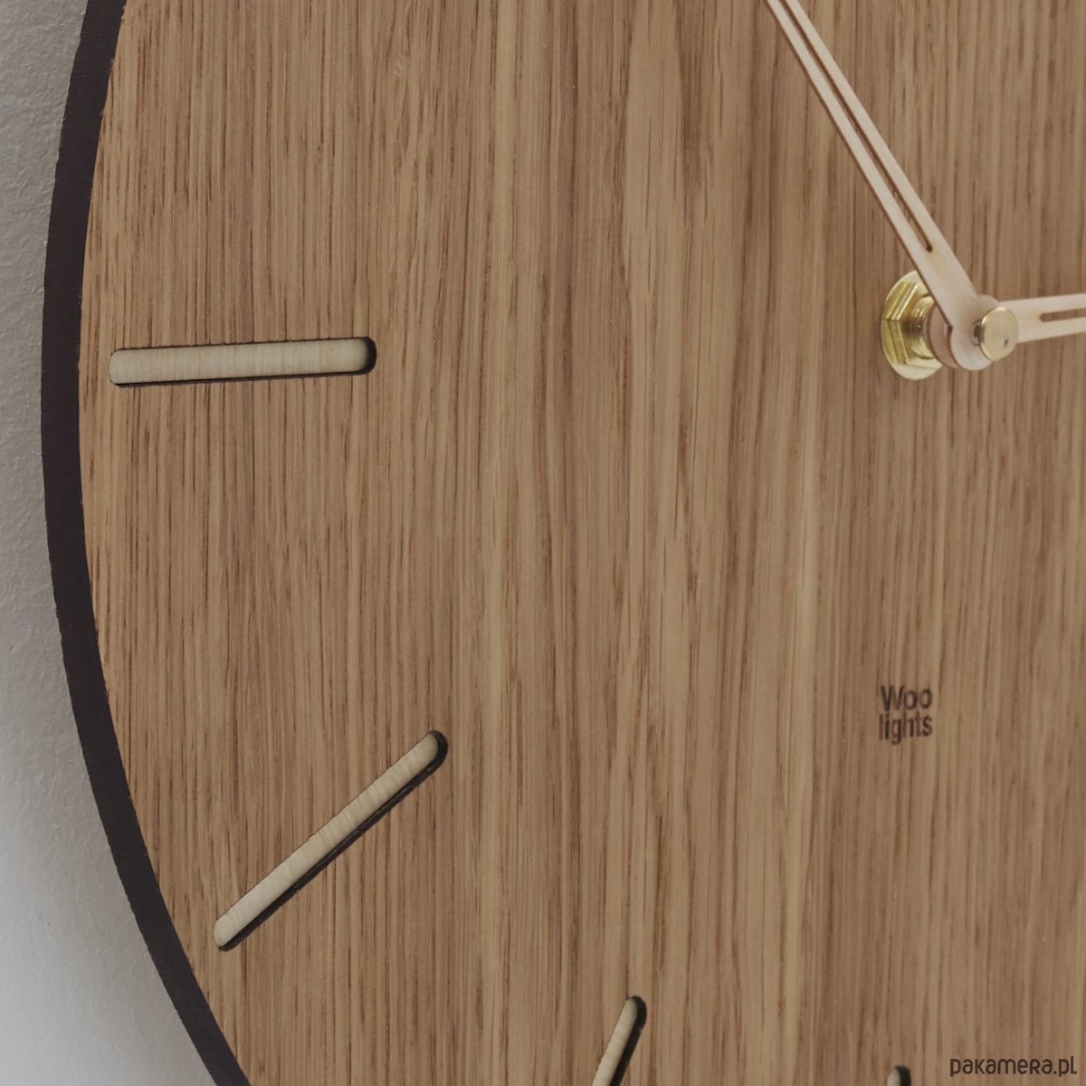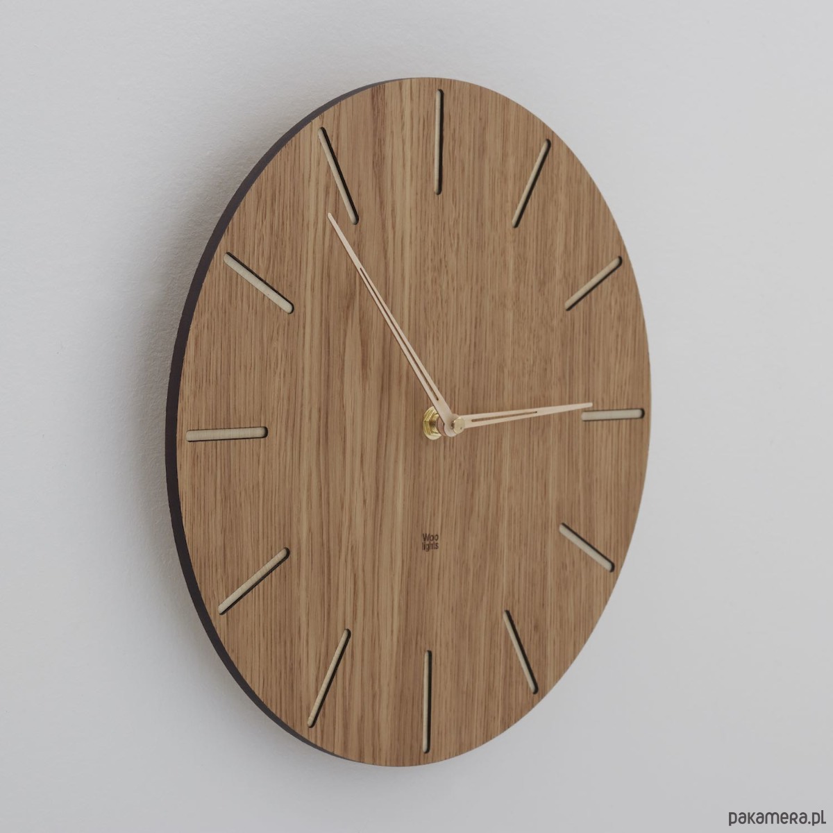 Zegar ścienny wykonany z drewna z prostymi znacznikami. Specjalnie zaprojektowane smukłe wskazówki wykonane są ze sklejki.