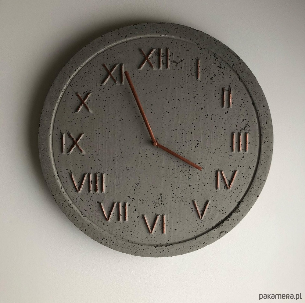 Tarcza w kolorze grafitowego betonu wraz z miedzianymi wskazówkami i rantem tworzą minimalistyczny, industrialny wygląd, który zachwyca swoim surowym urokiem.