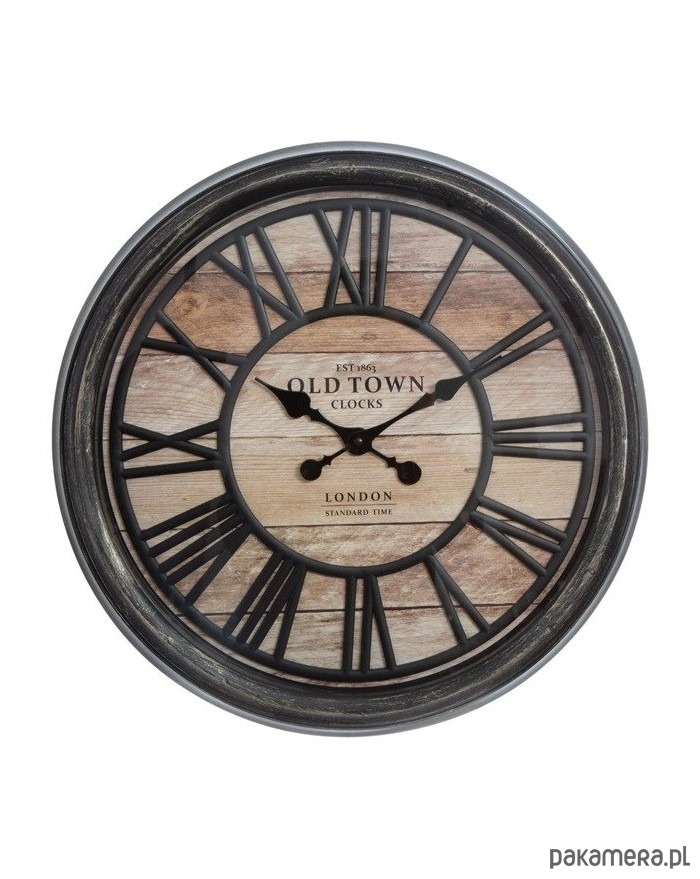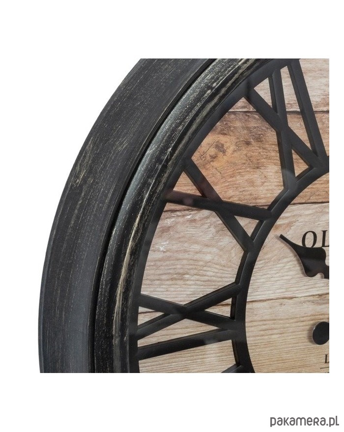 Duży zegar wskazówkowy o średnicy 50 cm, zawiera czytelne, duże rzymskie cyfry, które zostały umieszczone na cyferblacie imitującym brązowe, drewniane deski. Rama, cyfry oraz wskazówki są w kolorze czarnym. Przejrzysty cyferblat imitujący deski drewna, ma wyjątkowo stylowy design. Na cyferblacie znajduje się także napis, który dopełnia tej kompozycji.
