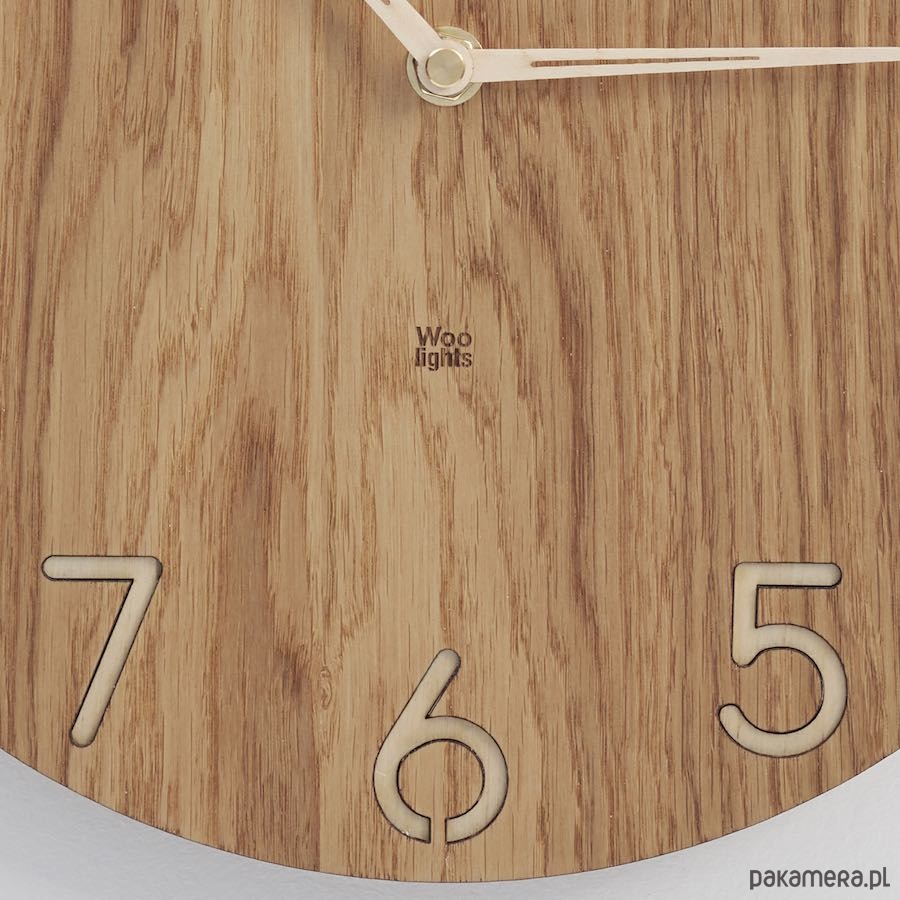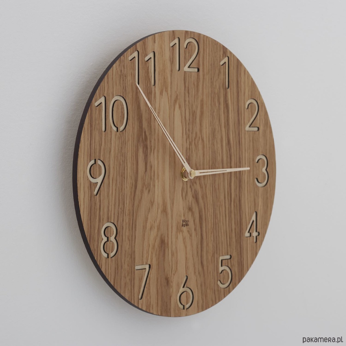 Zegar ścienny wykonany z drewna z dużymi cyframi.. Specjalnie zaprojektowane smukłe wskazówki wykonane są ze sklejki.