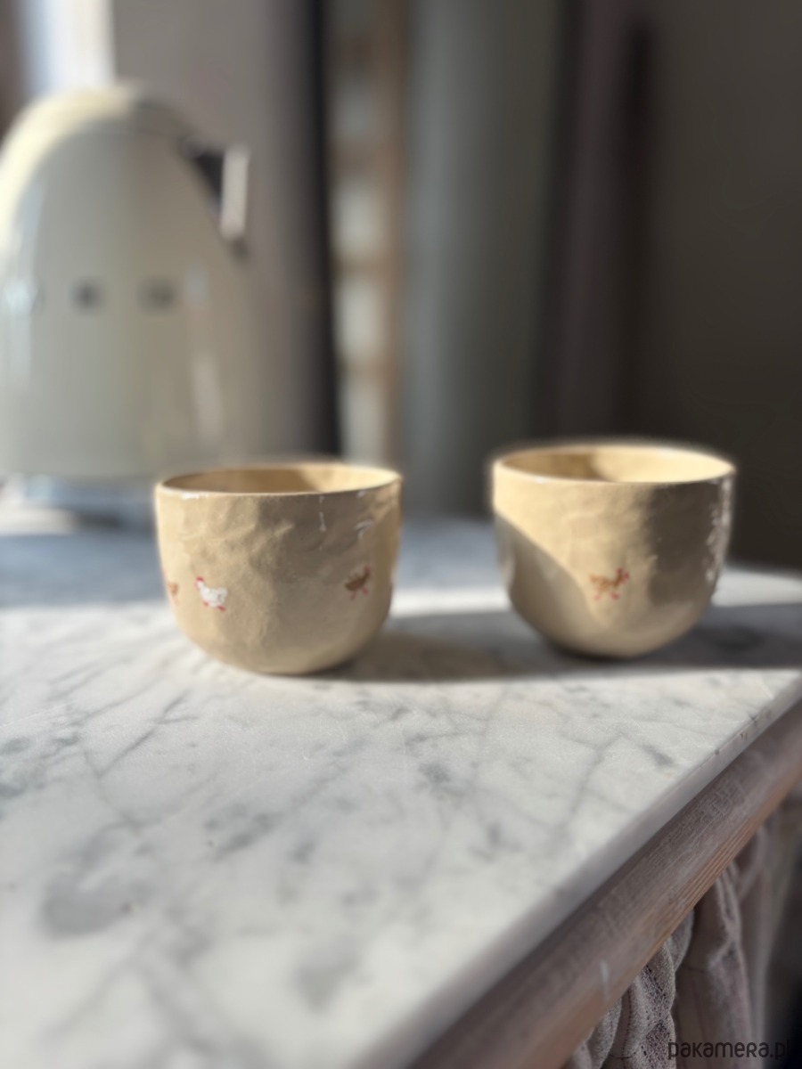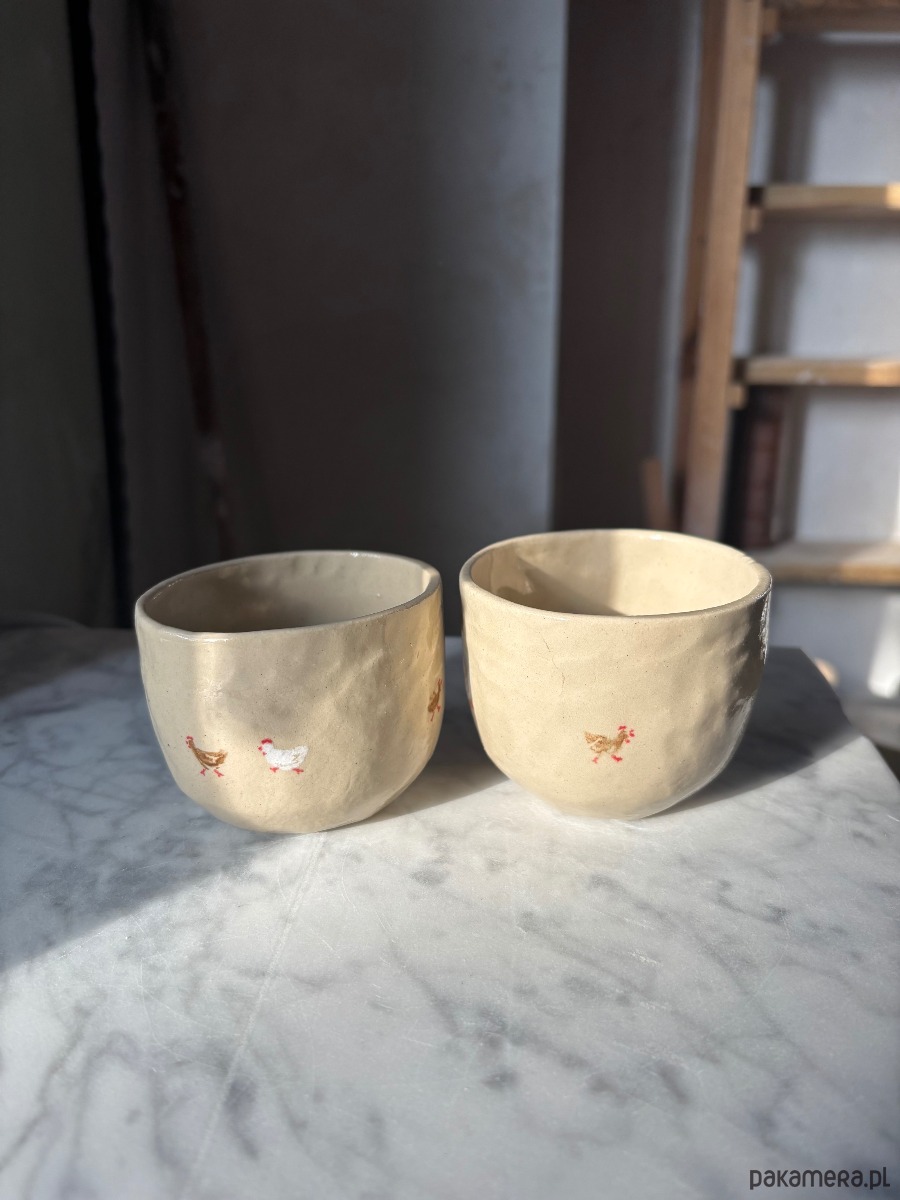 Zestaw 2 ręcznie wykonanych ceramicznych organicznych czarek z uroczymi ręcznie malowanymi kurami o pojemności ok 160 ml. Idealne na małe cappuccino, czy herbatę.