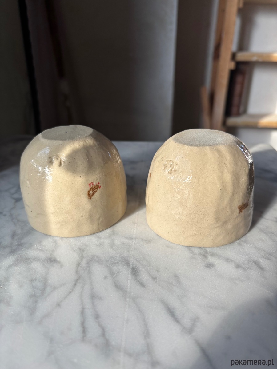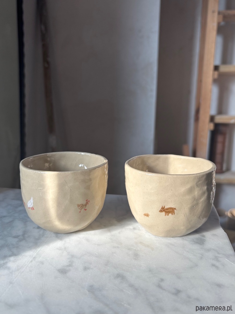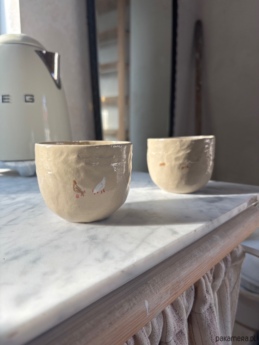 Zestaw 2 ręcznie wykonanych ceramicznych organicznych czarek z uroczymi ręcznie malowanymi kurami o pojemności ok 160 ml. Idealne na małe cappuccino, czy herbatę.