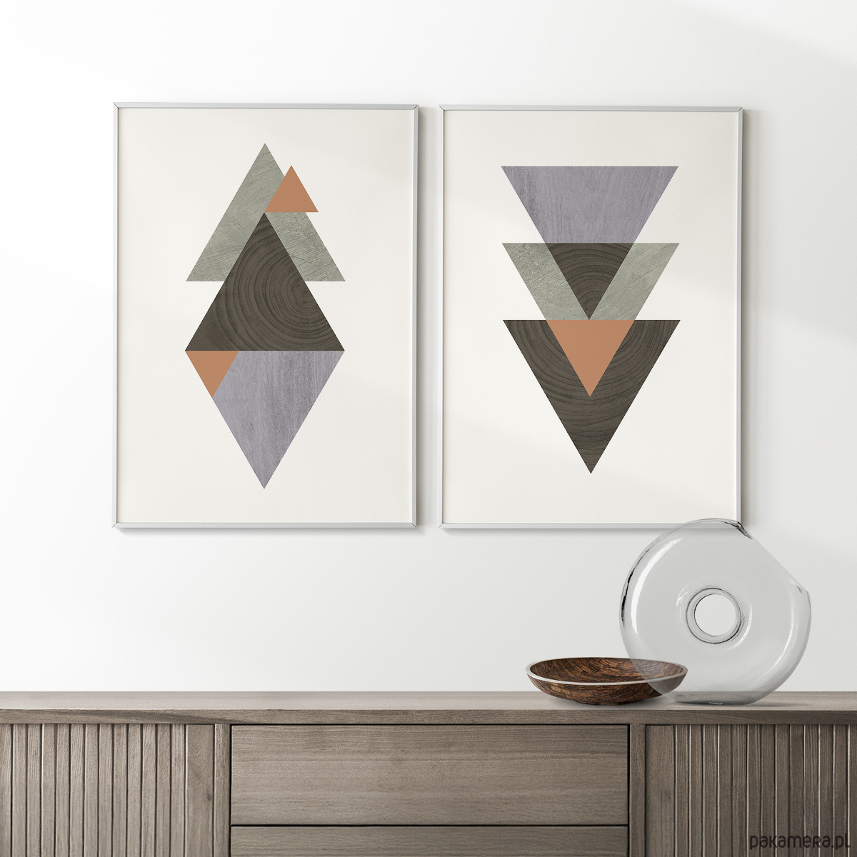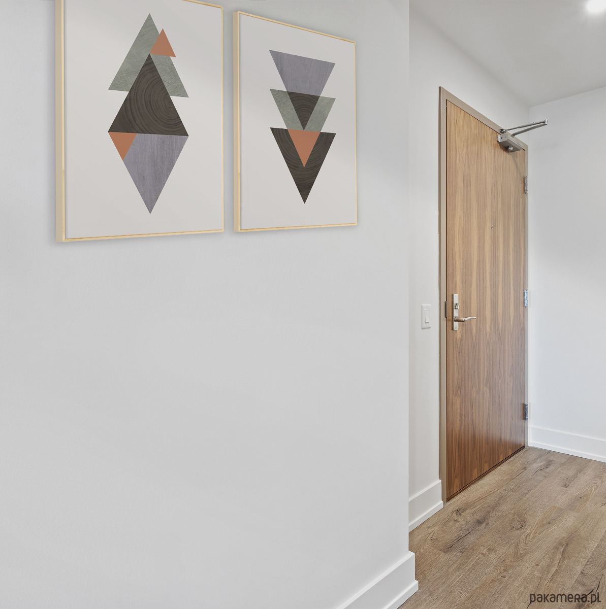 Zestaw 2 autorskich plakatów/grafik inspirowany stylem skandynawskim z elementami tekstury drewna. Geometryczne formy oraz przemyślana kolorystyka tworzą spójną kompozycję, która dobrze odnajdzie się we współczesnych, nowoczesnych i minimalistycznych wnętrzach. Plakaty mogą stanowić świetną dekorację ścian w biurze, salonie, sypialni, przedpokoju czy też kuchni, dodając wnętrzu elegancji i stylowego charakteru.