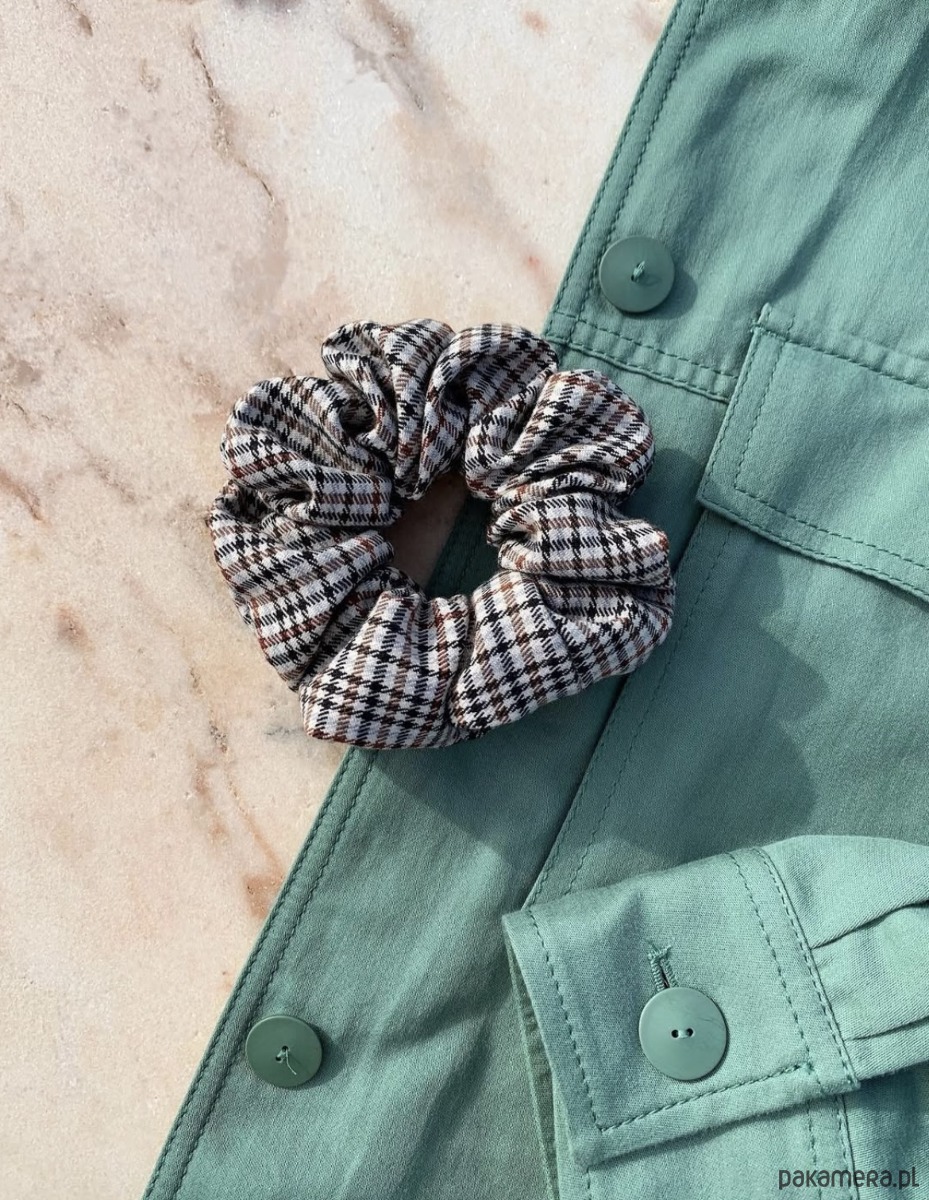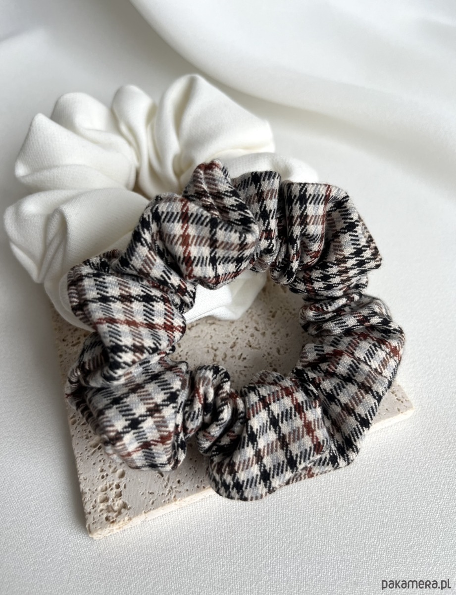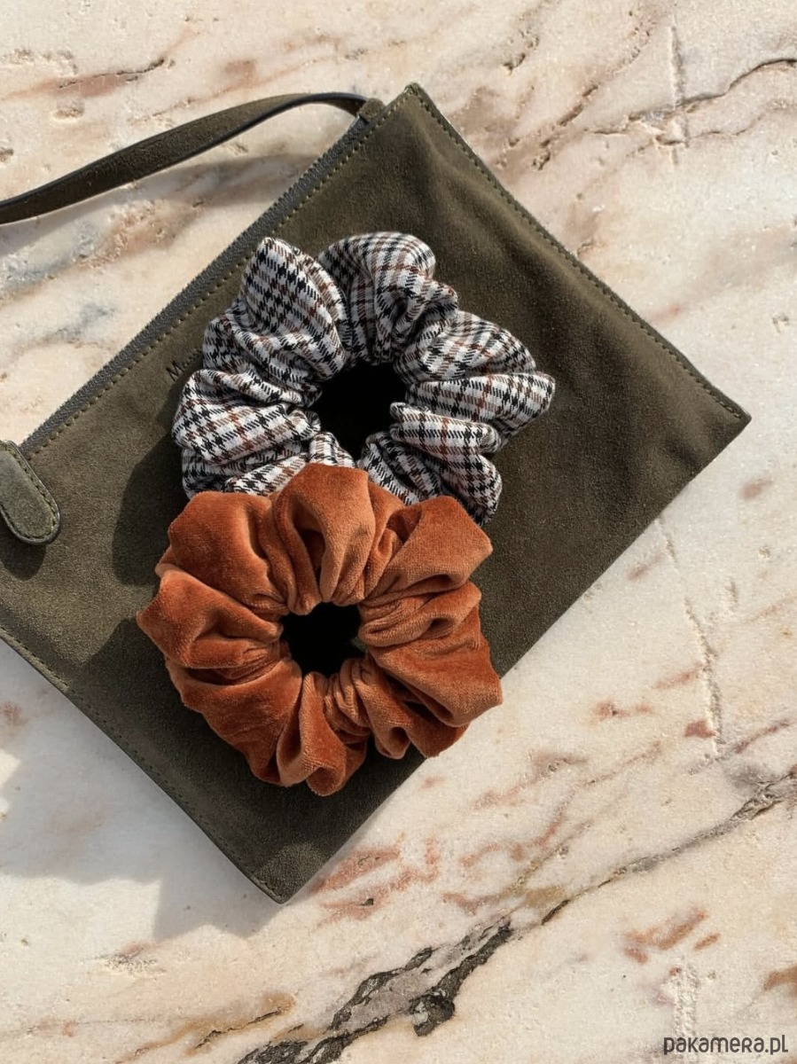 Zestaw 2 gumek do włosów scrunchies w wyjątkowych kolorach i wzorach - rudym i w krateczkę.