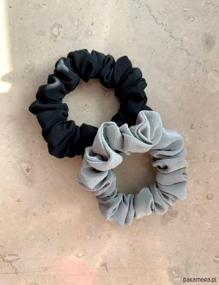 Zestaw 2 jedwabnych gumek scrunchies w wersji mini to duet idealny dla miłośniczek stonowanych, delikatnych akcentów. W zestawie scrunchies w kolorze szarym oraz czarnym.
