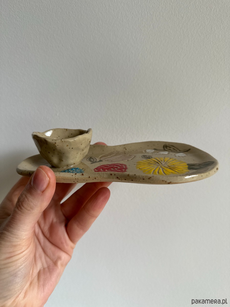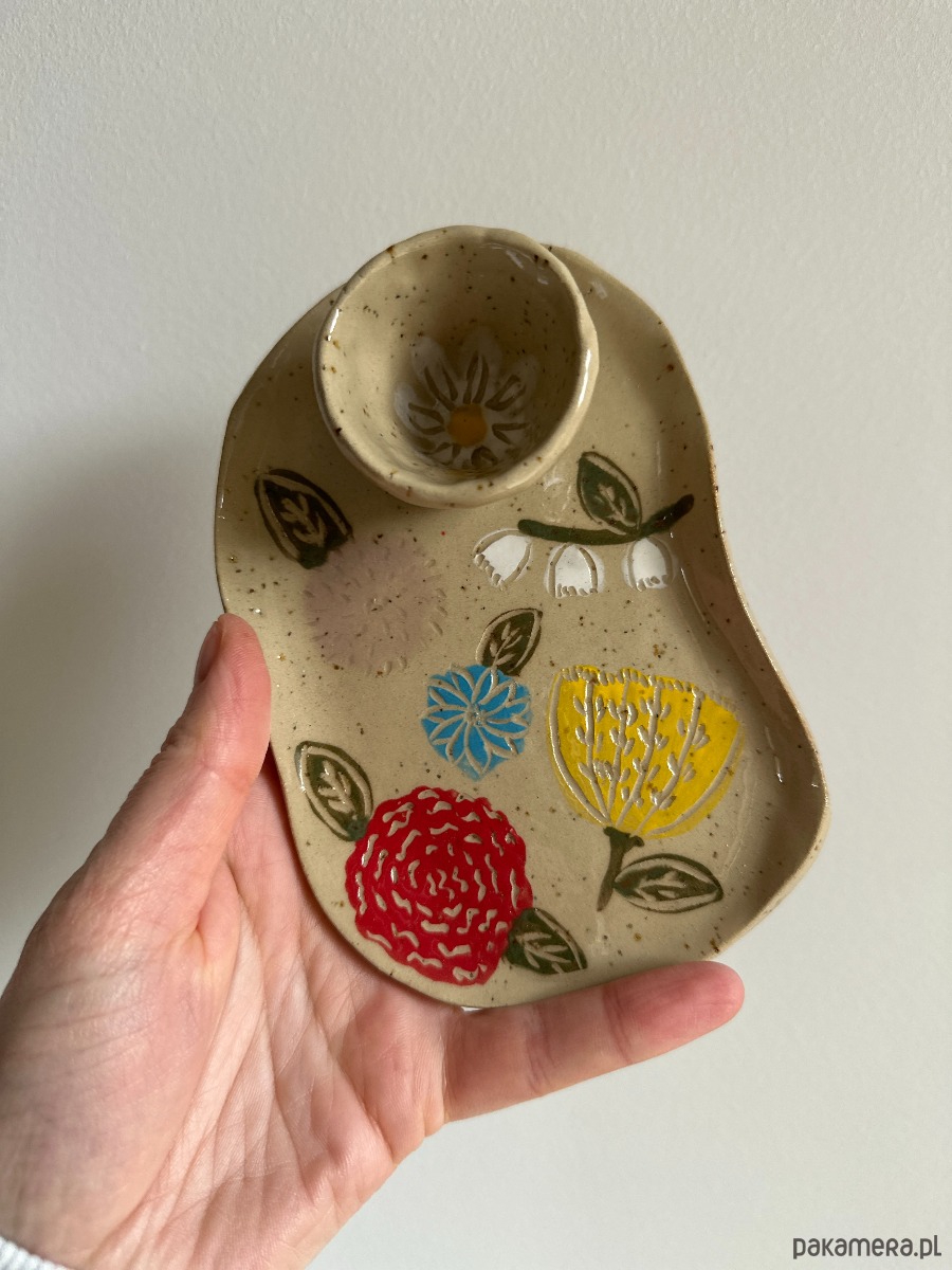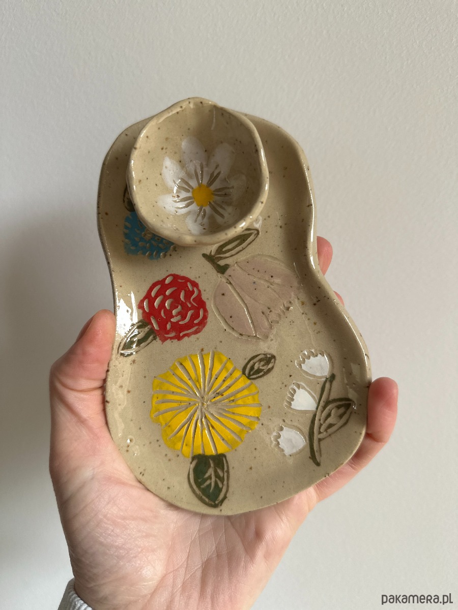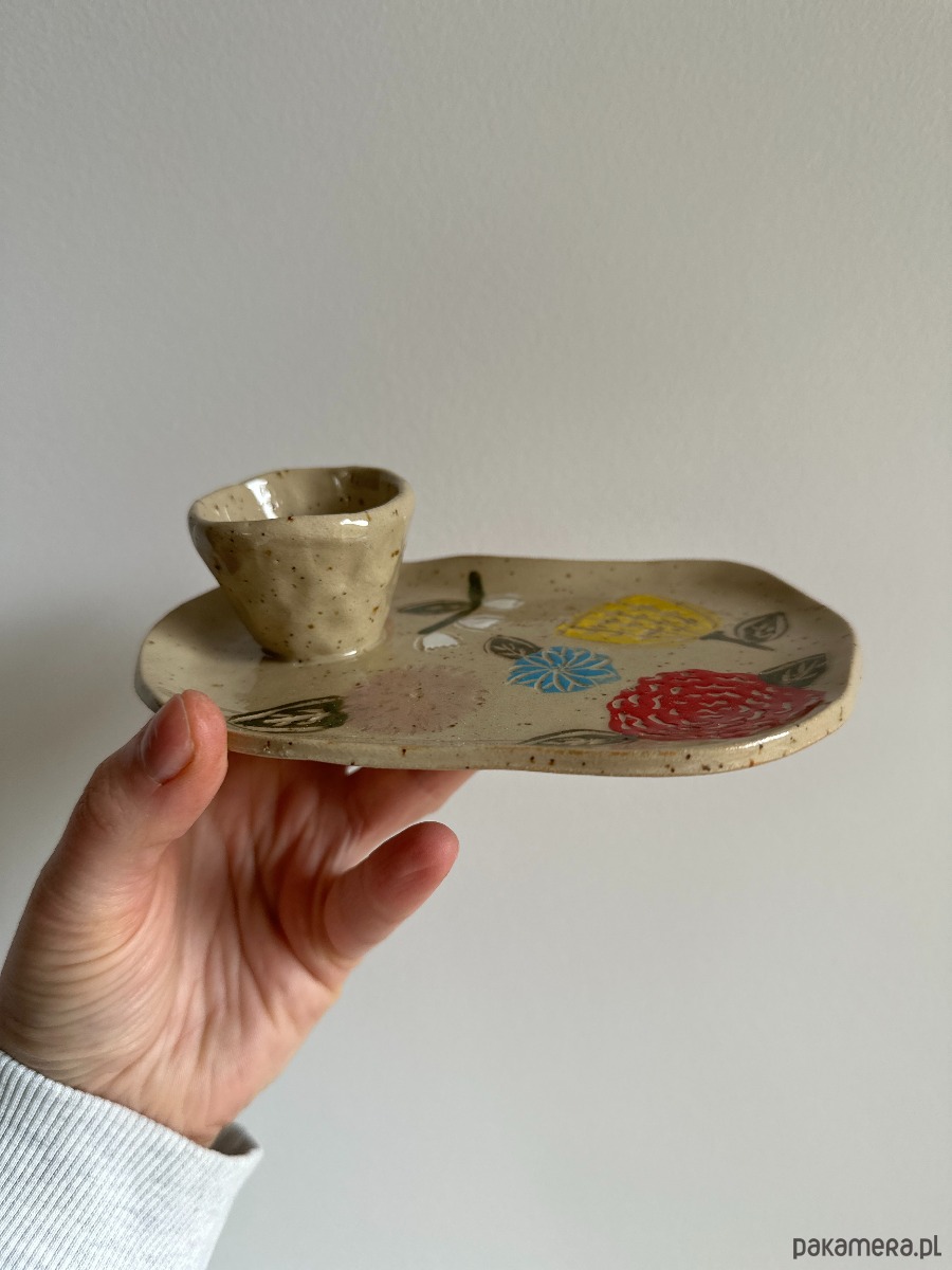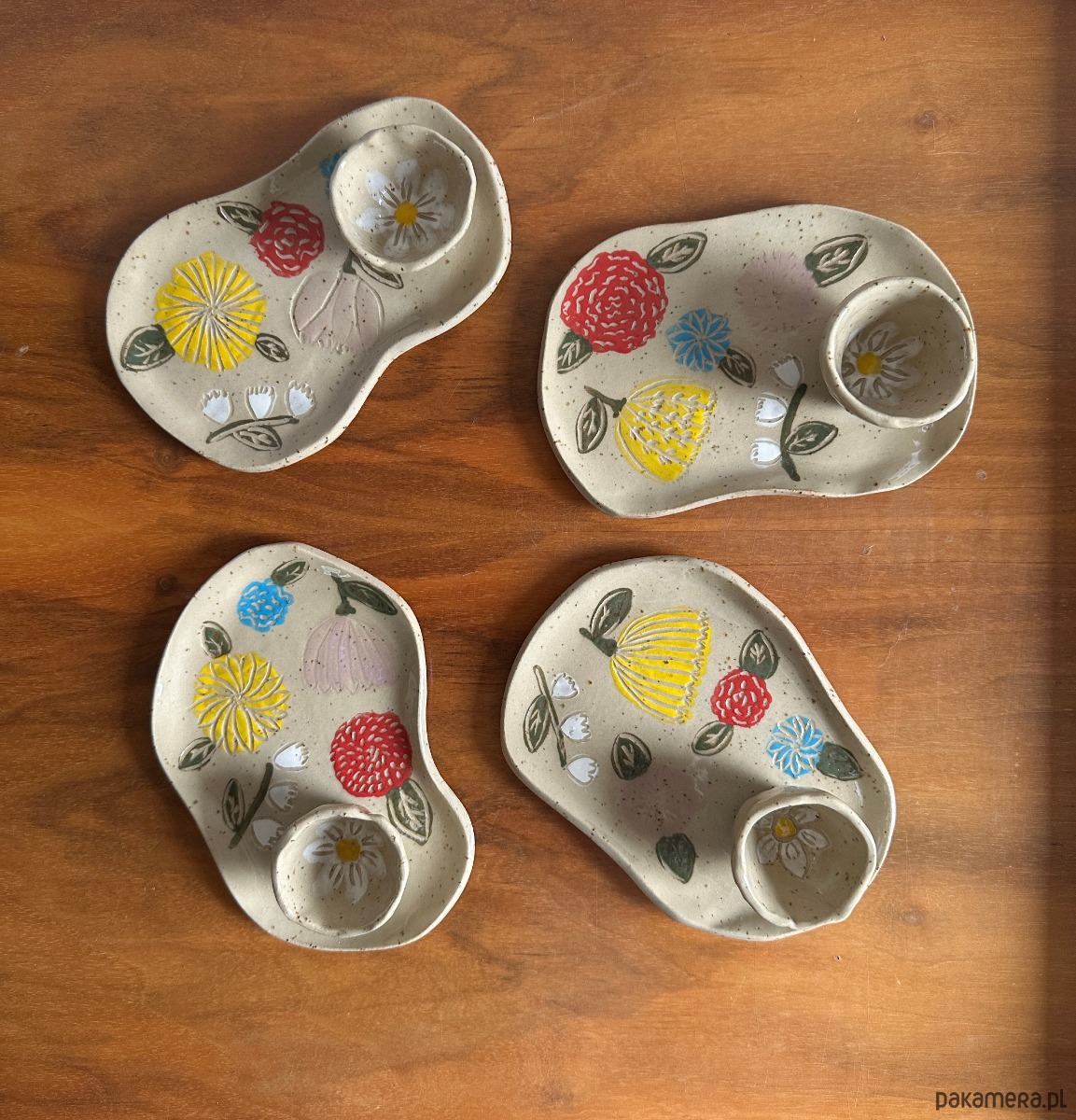 Każdy element został wykonany ręcznie z charakterystycznej, kropkowanej gliny, co nadaje mu unikalny wygląd i naturalny urok. Powierzchnia zdobiona jest pracochłonną metodą sgraffito, delikatne, kolorowe kwiaty zostały ręcznie wyryte i podkreślone barwą, dzięki czemu każdy zestaw jest jedyny w swoim rodzaju.