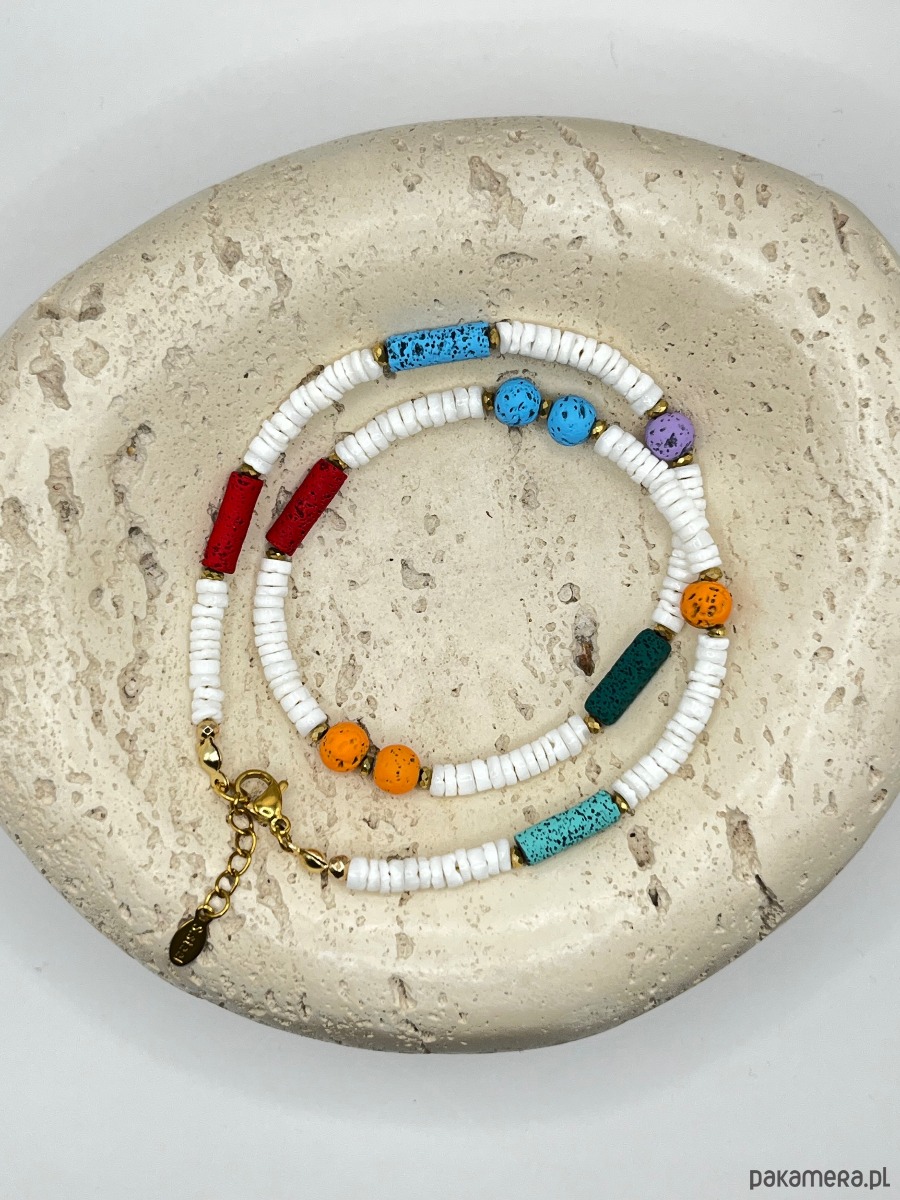 Zestaw 2 naszyjników, jeden z muszli i koralików z lawy w różnych kolorach (błękit, ciemna zieleń, pomarańczowy, fiolet, czerwony). Drugi naszyjnik w różowej palecie barw z różnych kamieni: rodonity, jaspis dalmatyński, jadeit, jaspis cesarski różowy, kamień rzeczny, masa perłowa. Ten zestaw kamieni przepięknie ze sobą współgra.
