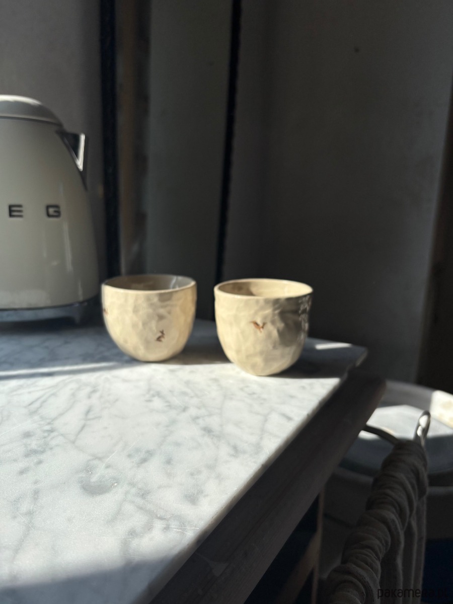 Czarki są celowo lepione bez użycia form, w związku z czym kształt nie jest idealny. Minimalistyczne ilustracje w połączeniu z organiczną bryłą nadają przedmiotom harmonii i kojącego, a jednocześnie radosnego charakteru.