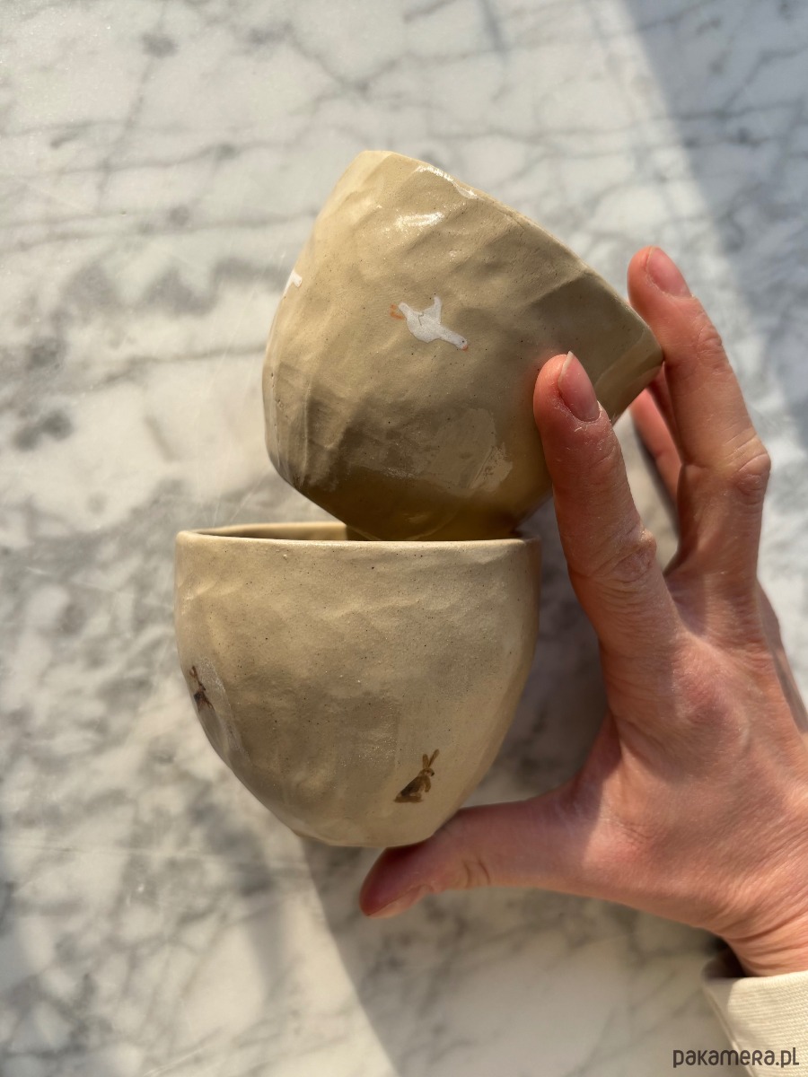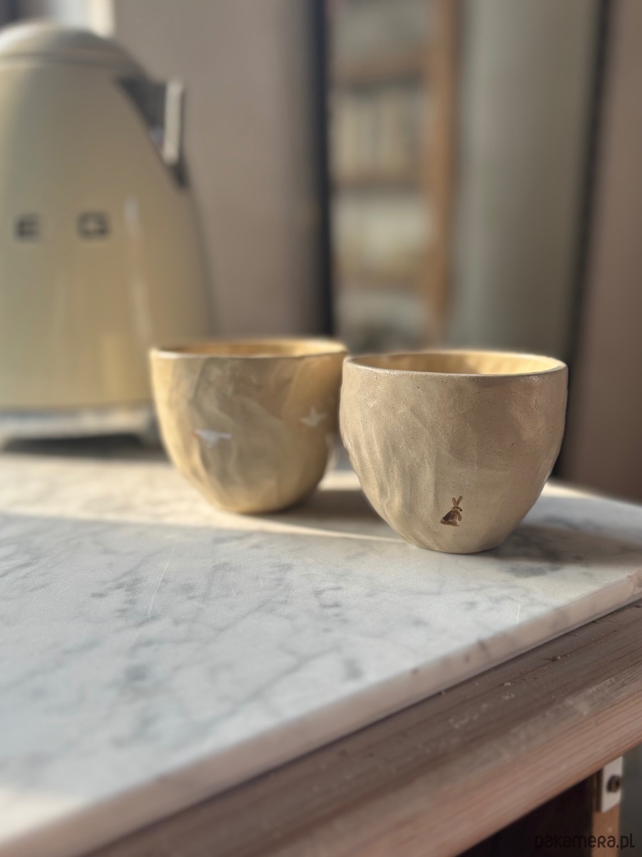 Zestaw 2 ręcznie formowanych ceramicznych czarek z zającami w skandynawskim stylu o unikatowym szkliwieniu inspirowanym wiosną.