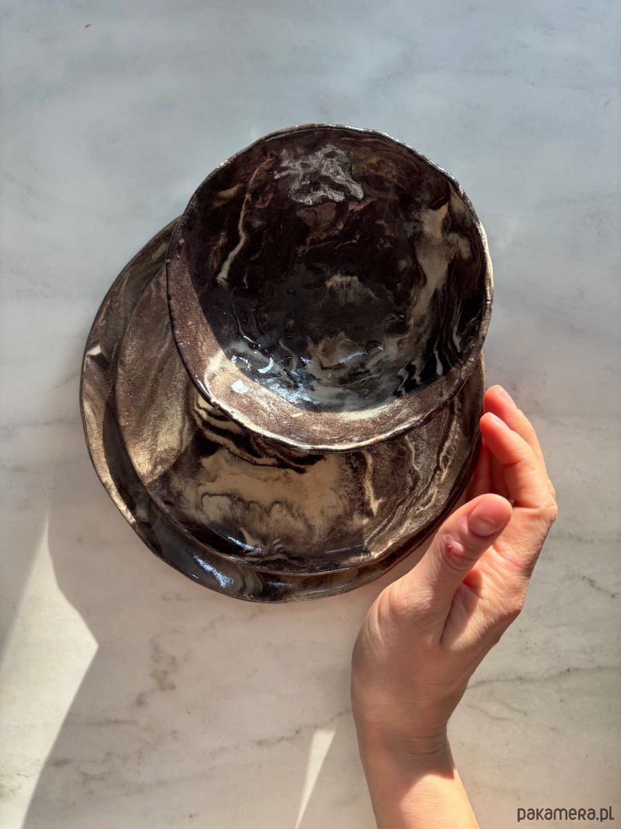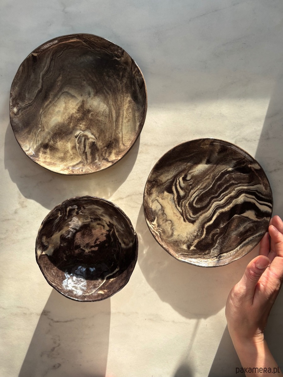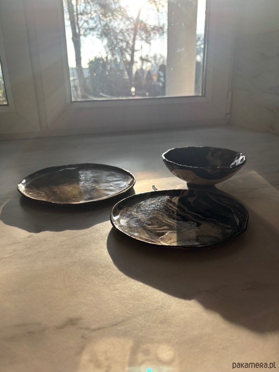 Zestaw ręcznie wykonanych ceramicznych talerzy i miseczki, idealnych na wieczorną ucztę, przekąski, lub śniadanie.