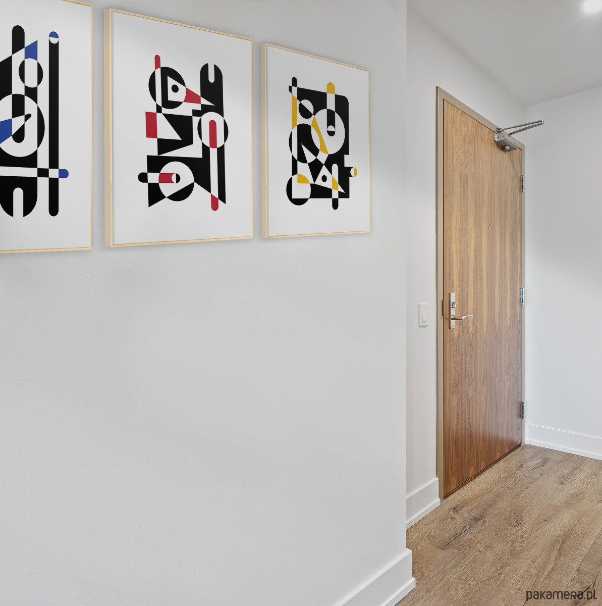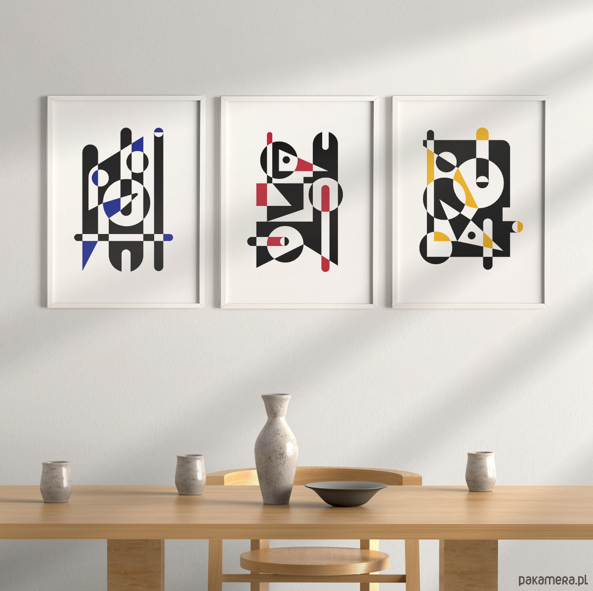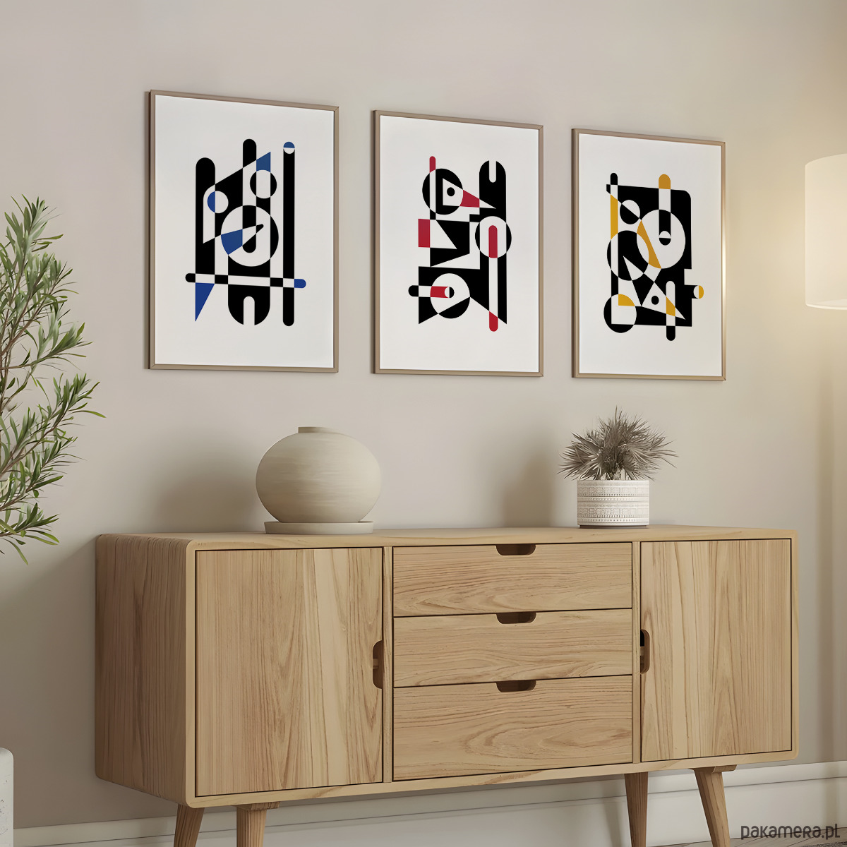 Zestaw trzech abstrakcyjnych, geometrycznych plakatów. Proste formy i przemyślana kompozycja sprawiają, że grafiki świetnie odnajdą się w każdym wnętrzu – od salonu, przez sypialnię, aż po korytarz. To łatwy sposób na dodanie charakteru i stworzenie spójnej, eleganckiej aranżacji.