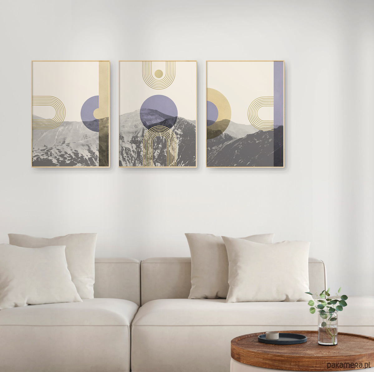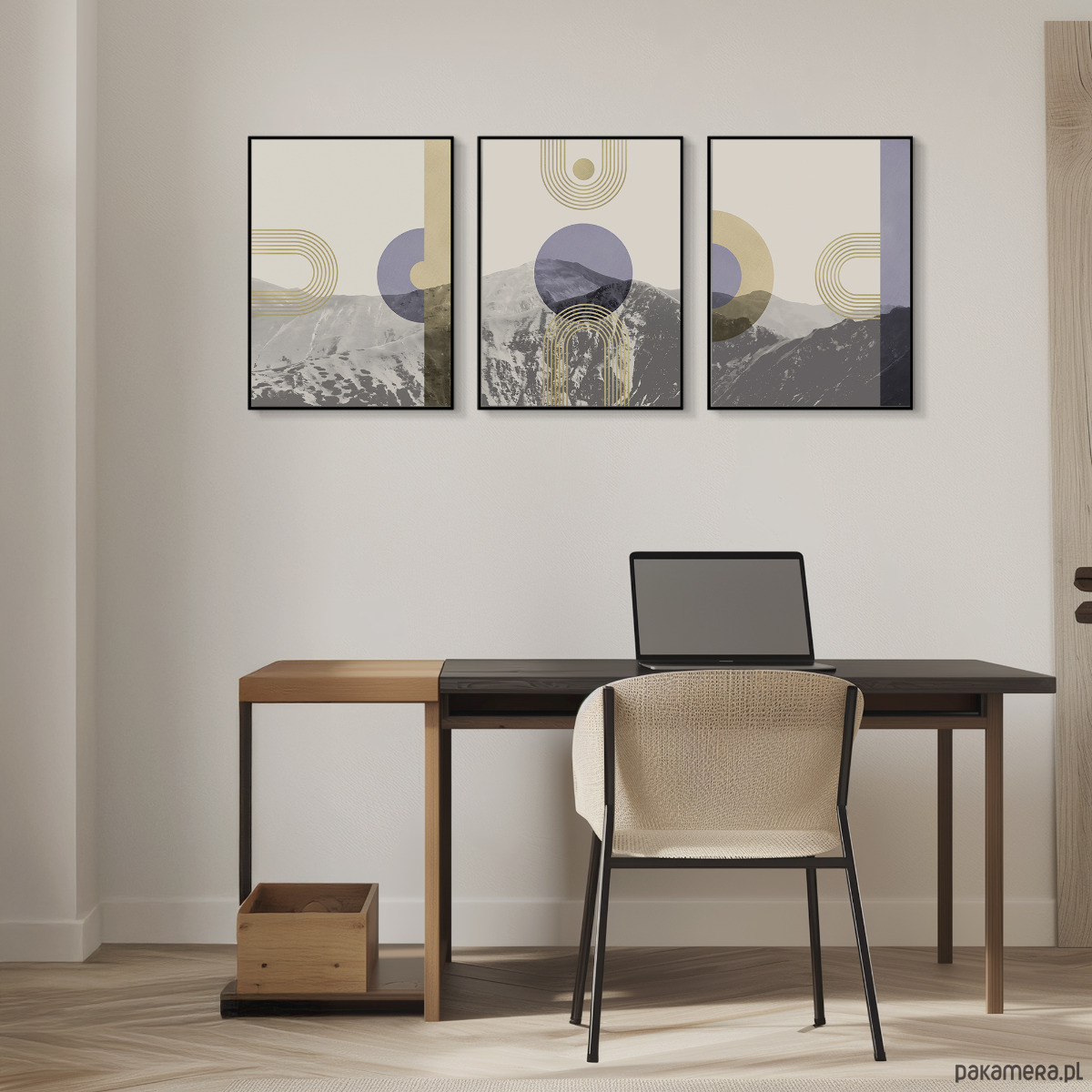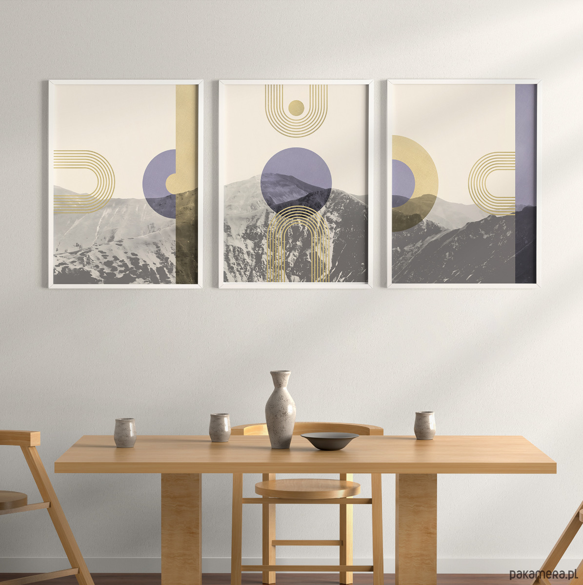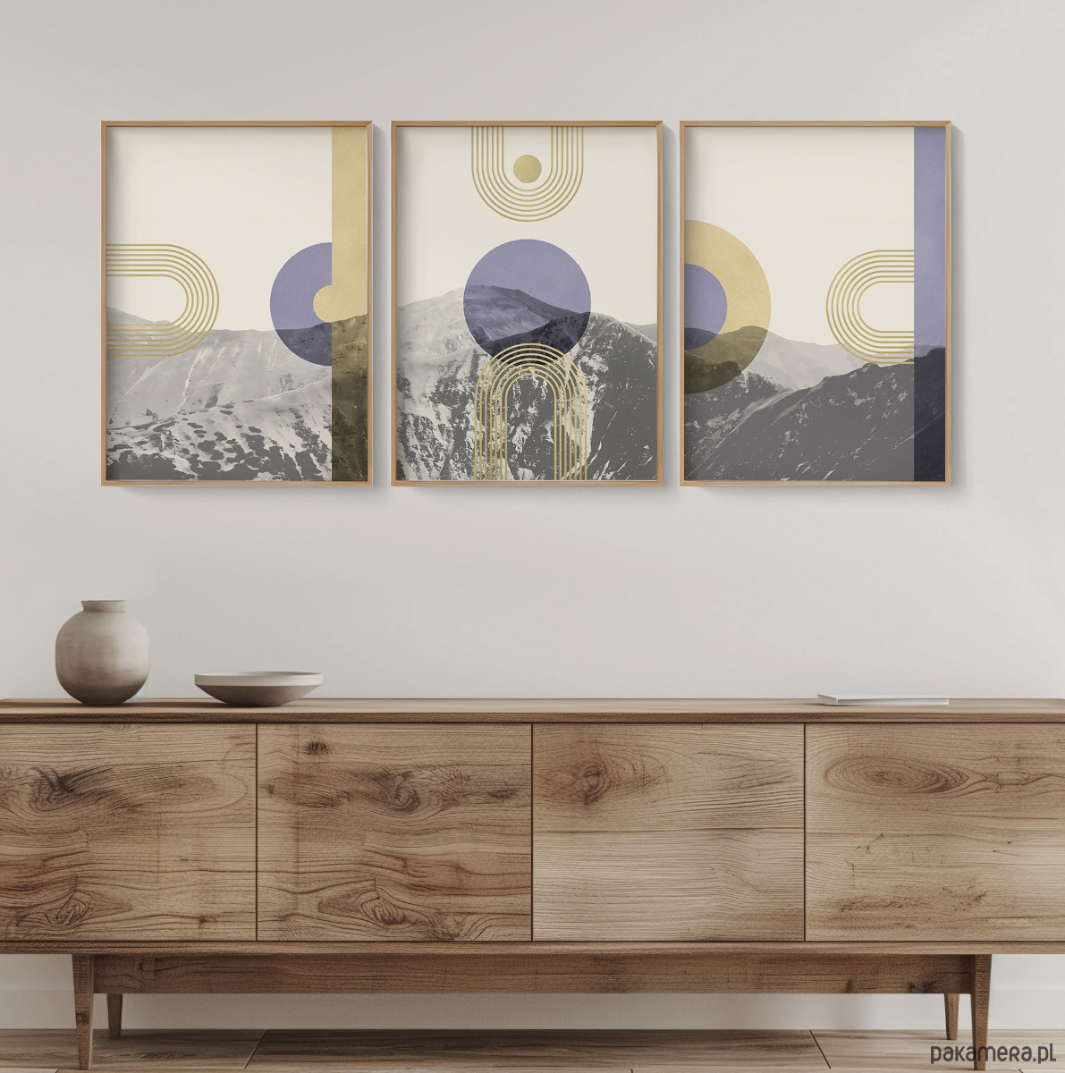 Abstrakcyjny zestaw 3 plakatów w formie tryptyku z wizerunkiem Tatr w nowoczesnym wydaniu mid-century. Połączenie realistycznej fotografii gór z geometrycznymi elementami nadaje kompozycji elegancki, designerski charakter.