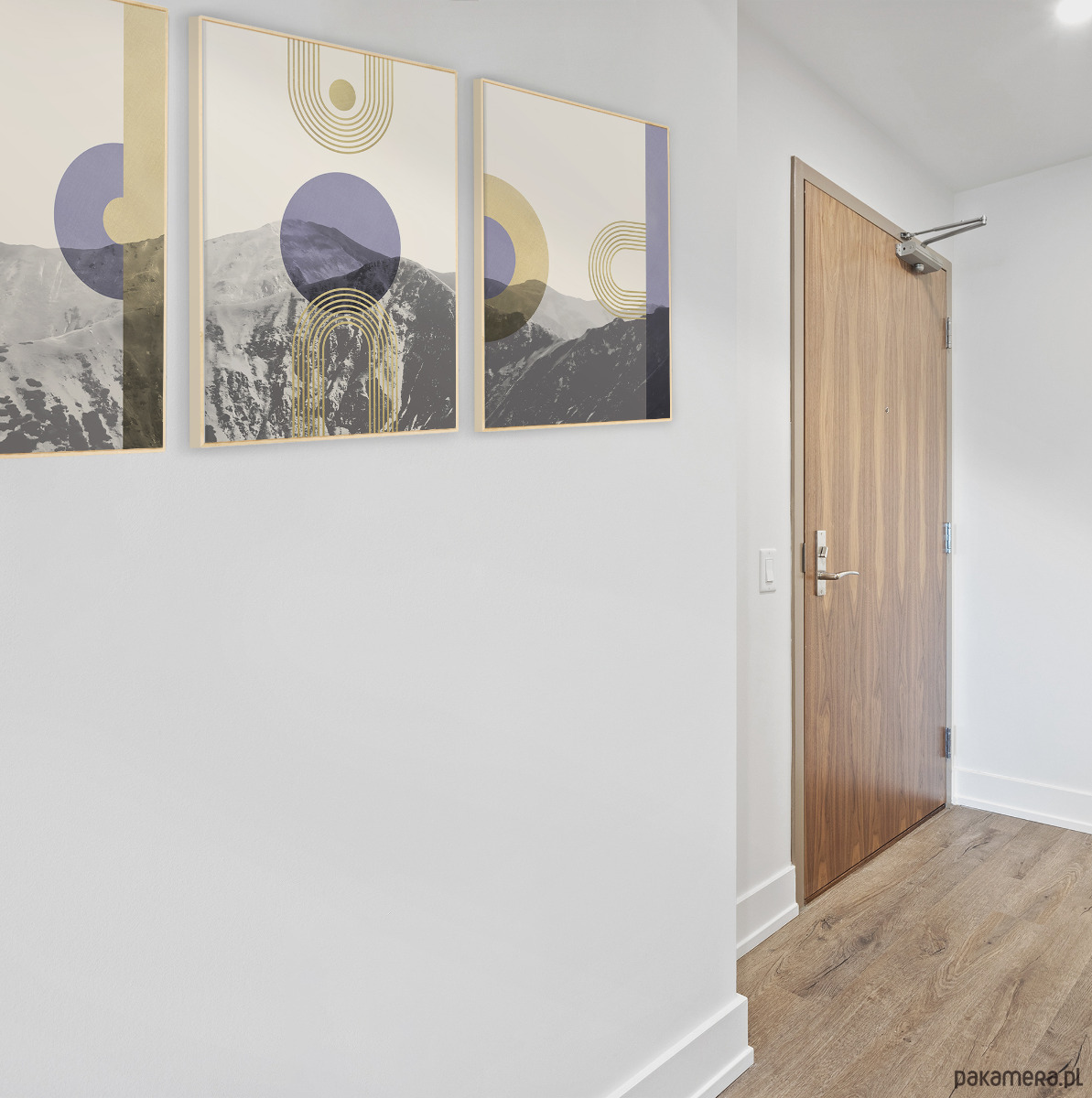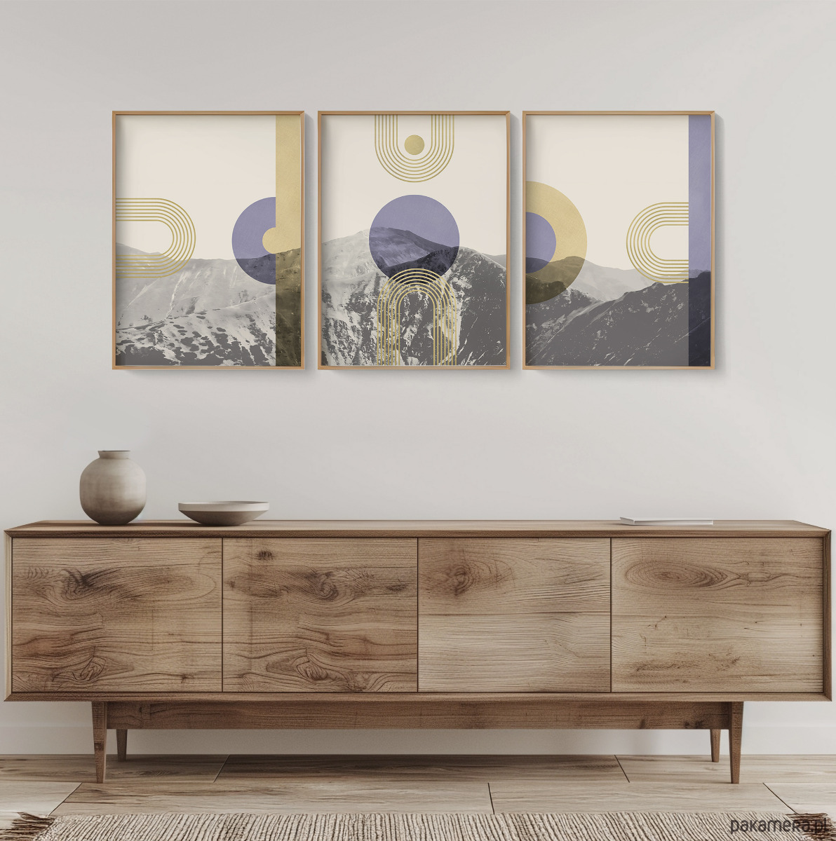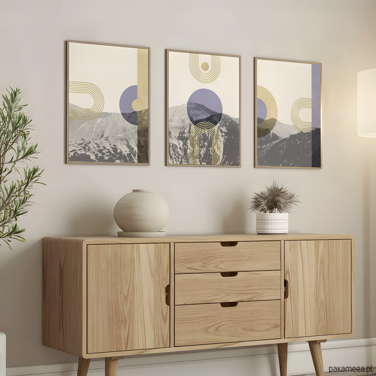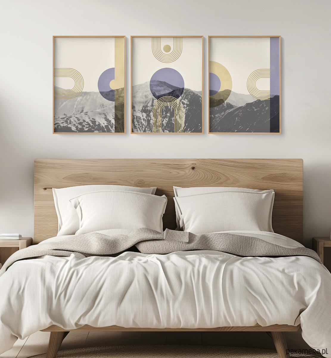 Abstrakcyjny zestaw 3 plakatów w formie tryptyku z wizerunkiem Tatr w nowoczesnym wydaniu mid-century. Połączenie realistycznej fotografii gór z geometrycznymi elementami nadaje kompozycji elegancki, designerski charakter.