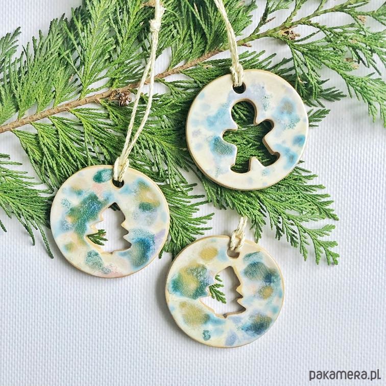 Zestaw 3 okrągłych zawieszek ceramicznych: z motywem choinki i piernikowego ludka.
