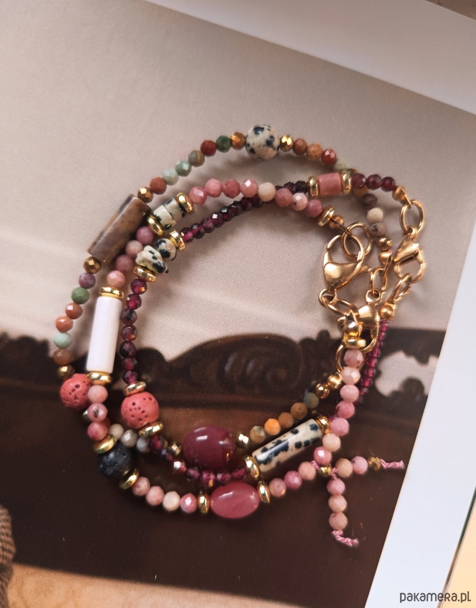 Zestaw 3 bransoletek z granatów, agatów,jaspisu dalmatyńskiego,akwamarynu , złotych hematytów i rodonitu z zapięciem ze stali chirurgicznej. Całość na jedwabnej czerwonej wytrzymałej nici.na zamówienie.Wykonano ręcznie.Pakuję w eleganckie pudełko z logo.