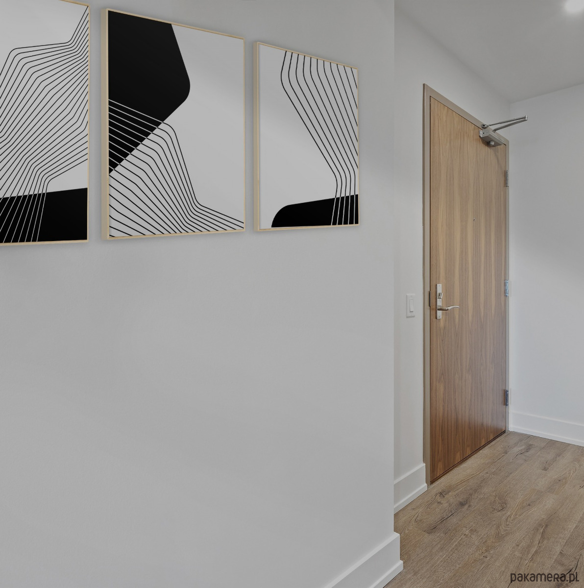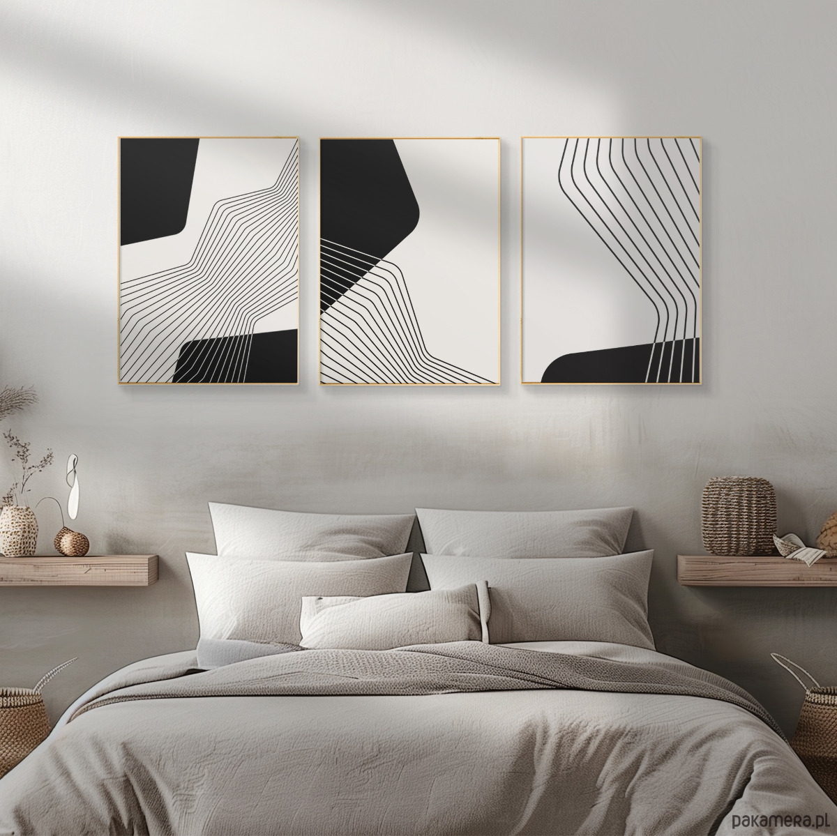 Zestaw 3 czarno-białych plakatów geometrycznych, minimalistycznych.