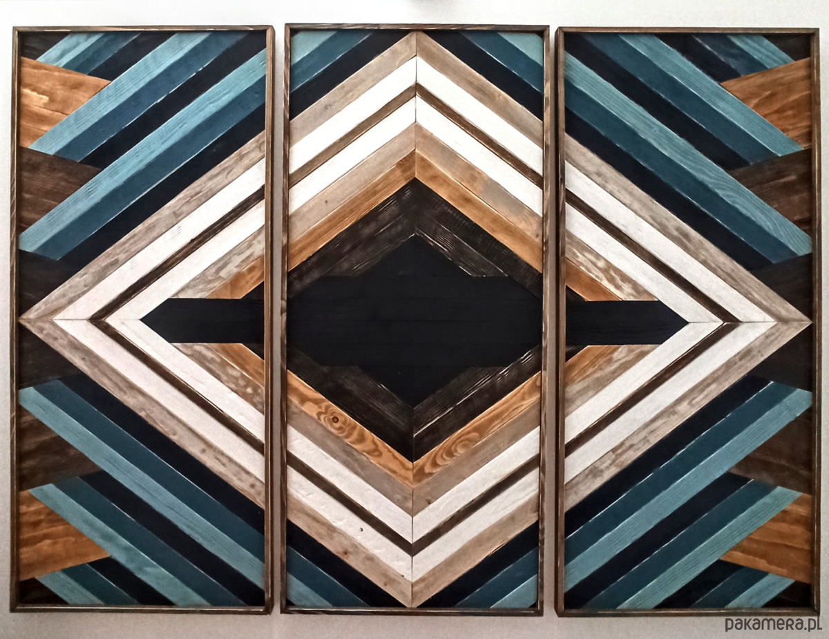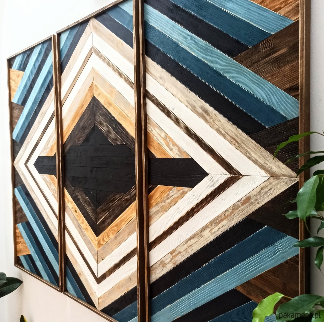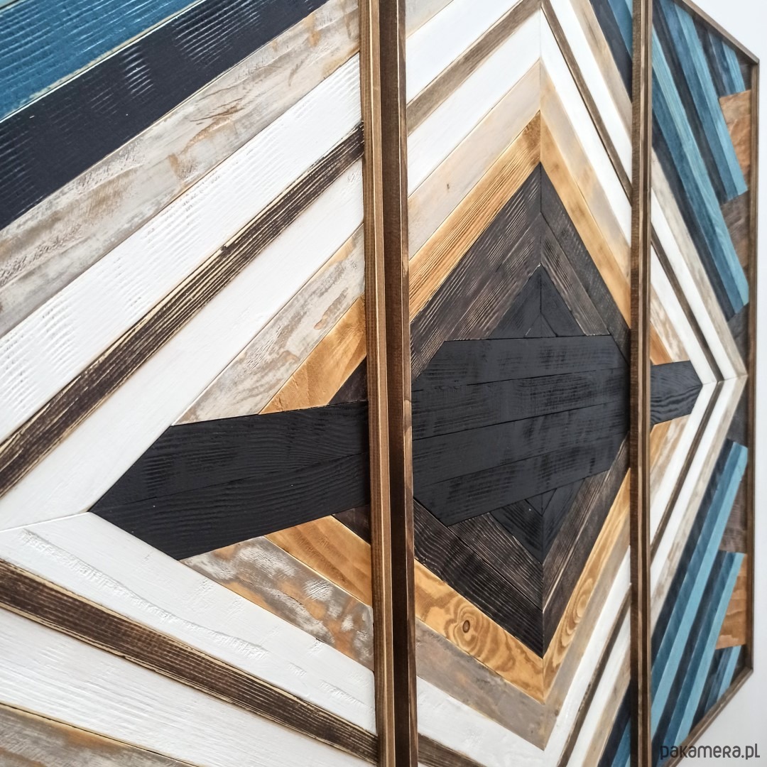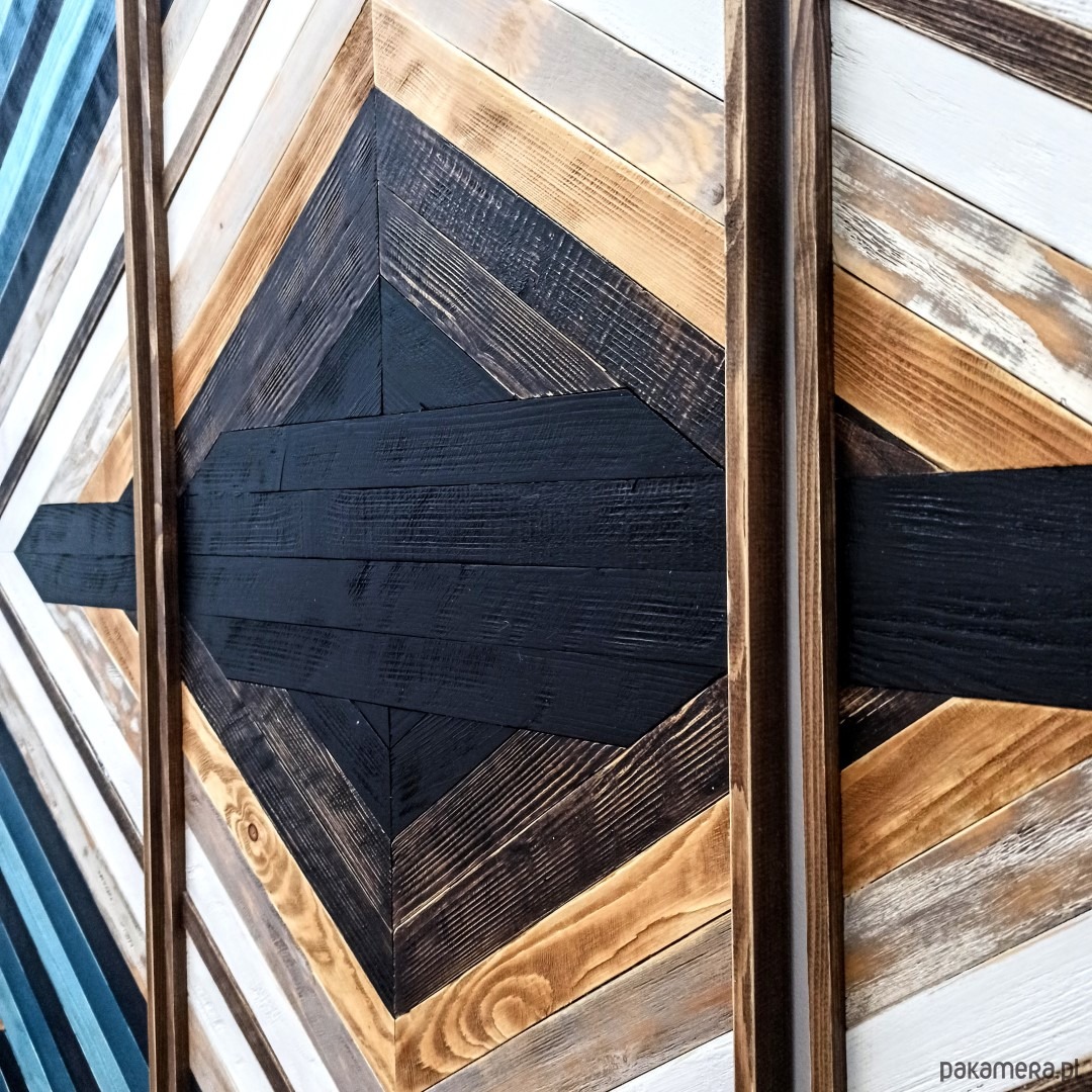 Inspiracja boho chic i geometrią. Obraz w całości wykonany z litego drewna pokryty bejcą podkreślającą słoje z dodatkiem koloru czarnego i białego.
