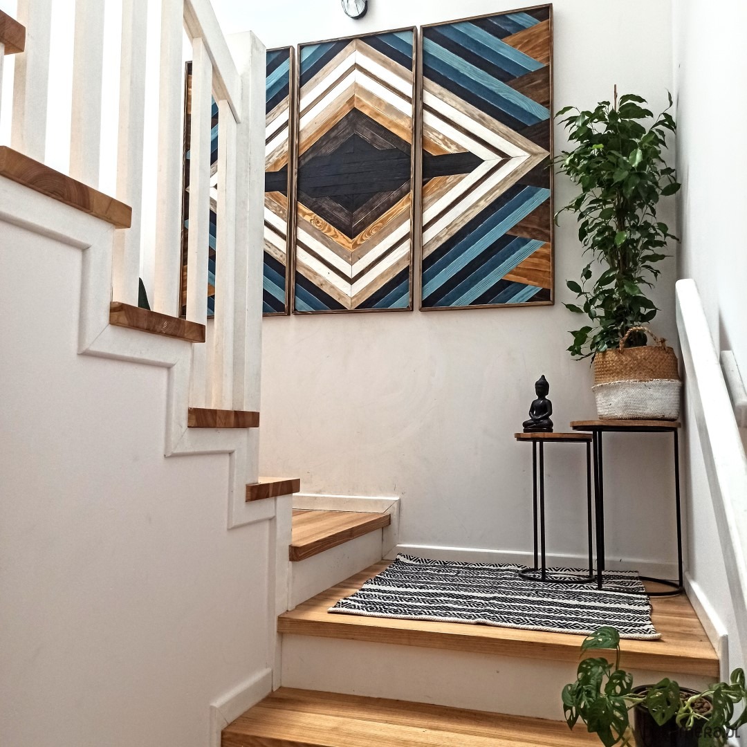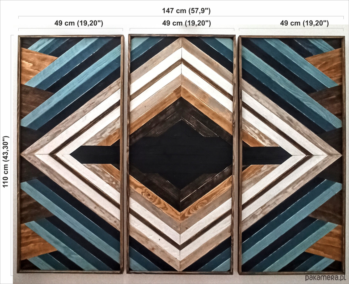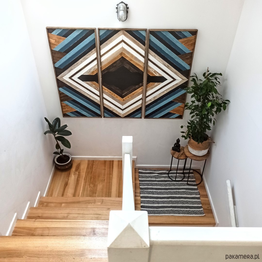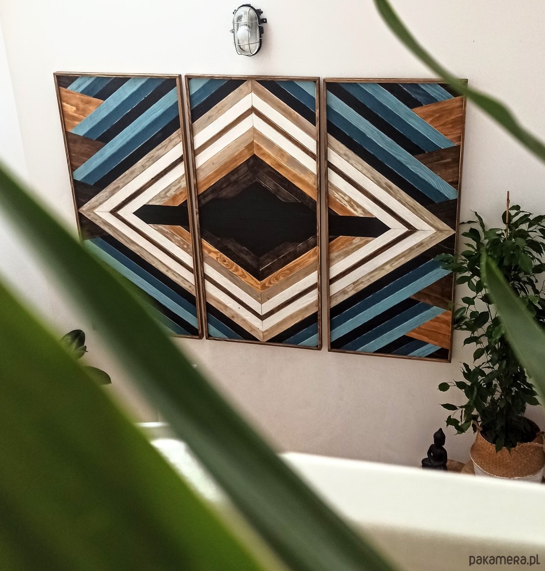 Inspiracja boho chic i geometrią. Obraz w całości wykonany z litego drewna pokryty bejcą podkreślającą słoje z dodatkiem koloru czarnego i białego.