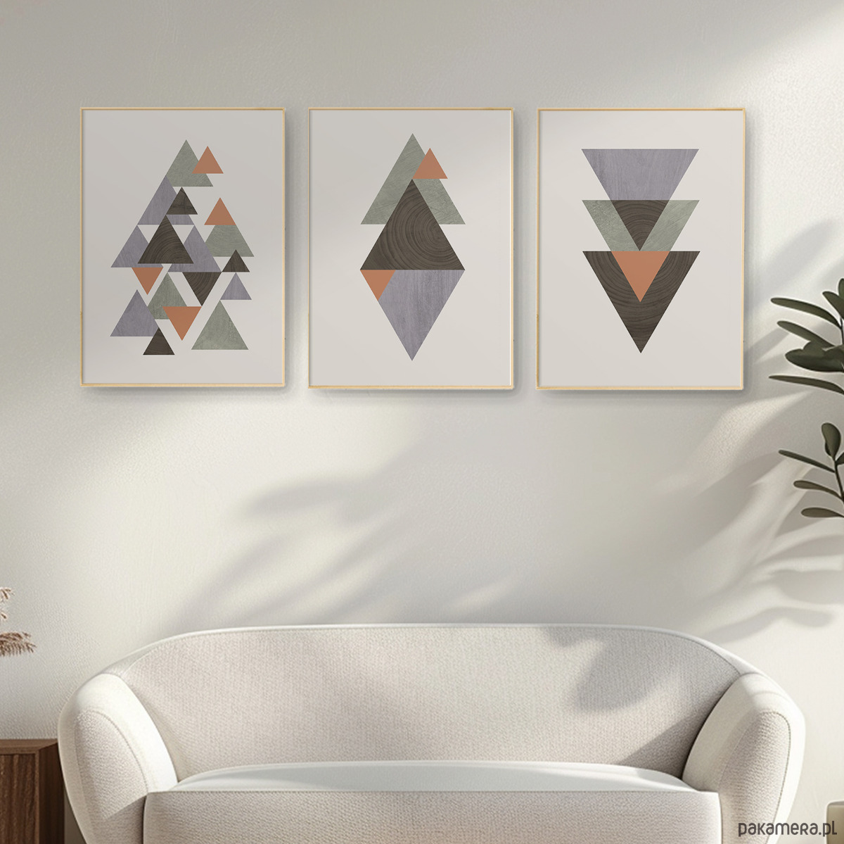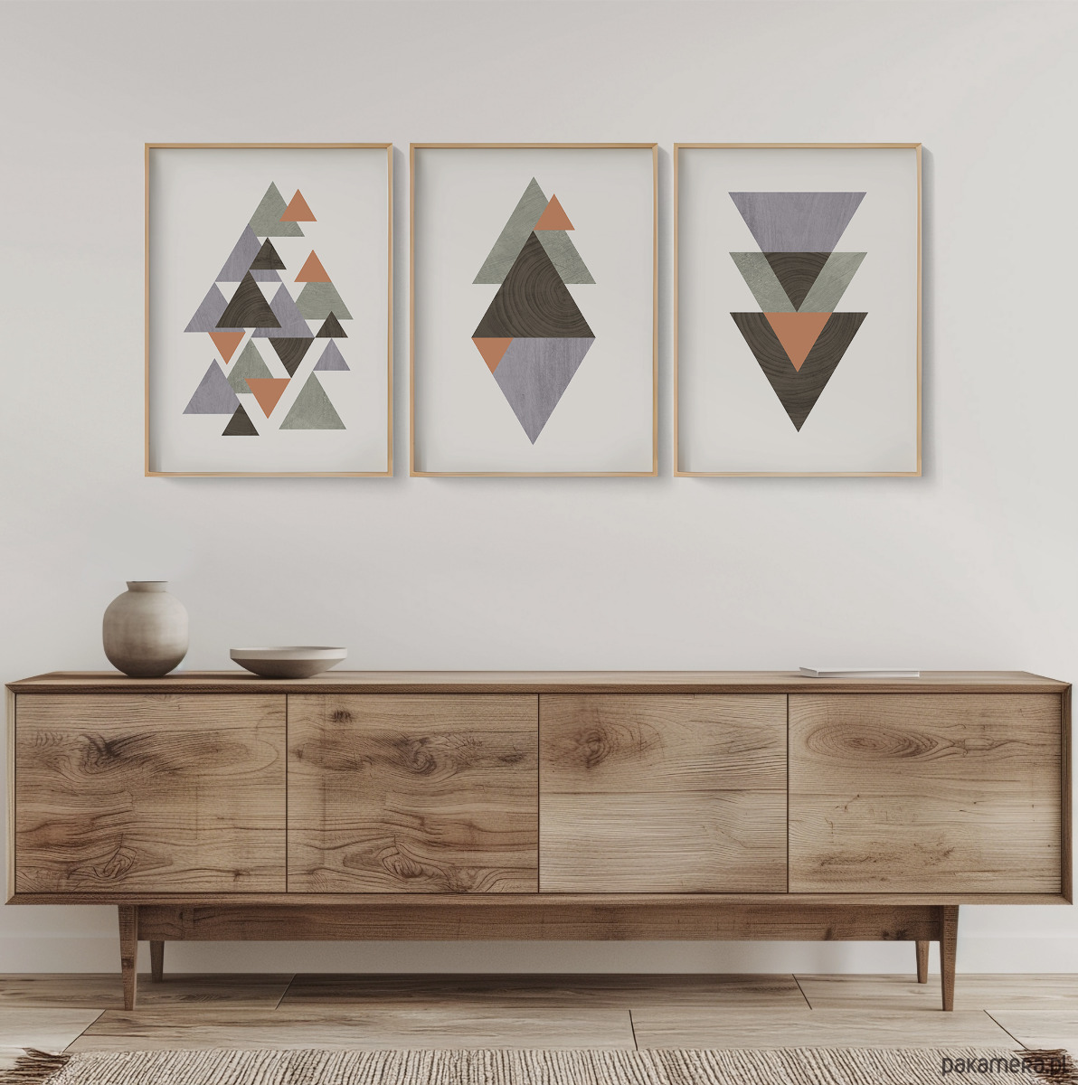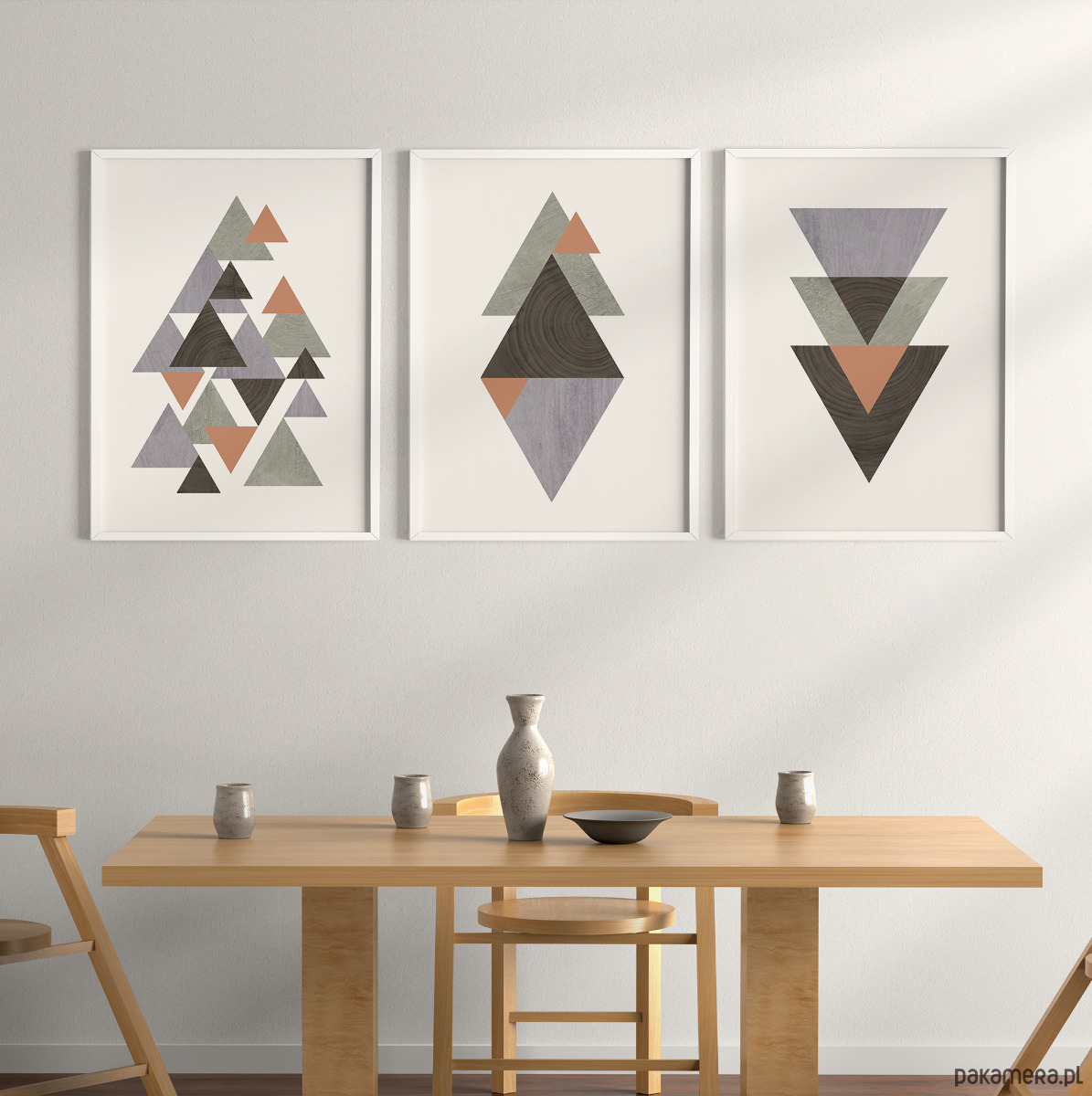 Zestaw 3 autorskich plakatów/grafik inspirowany stylem skandynawskim z elementami tekstury drewna. Geometryczne formy oraz przemyślana kolorystyka tworzą spójną kompozycję, która dobrze odnajdzie się we współczesnych, nowoczesnych i minimalistycznych wnętrzach. Plakaty mogą stanowić świetną dekorację ścian w biurze, salonie, sypialni, przedpokoju czy też kuchni, dodając wnętrzu elegancji i stylowego charakteru.