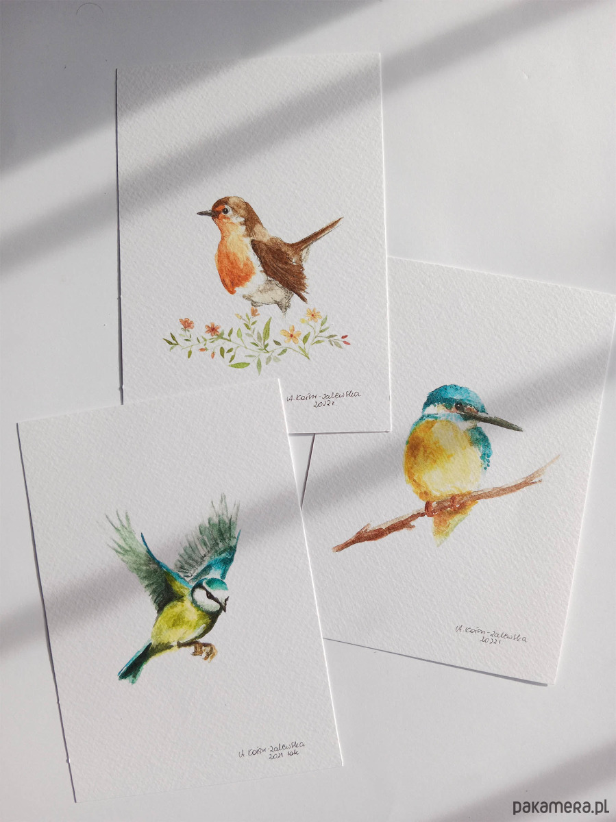 Zestaw 3 ilustacji ptaszkiów: Zimorodka, Rudzika oraz Sikorki