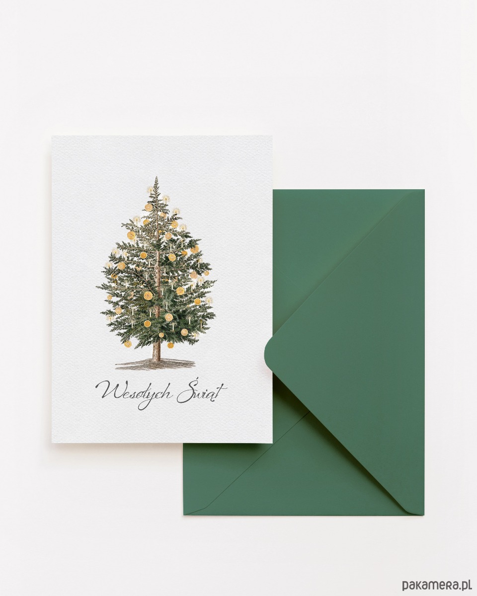 Do kartek są dołączone ciemno-zielone koperty w klimacie świątecznym.