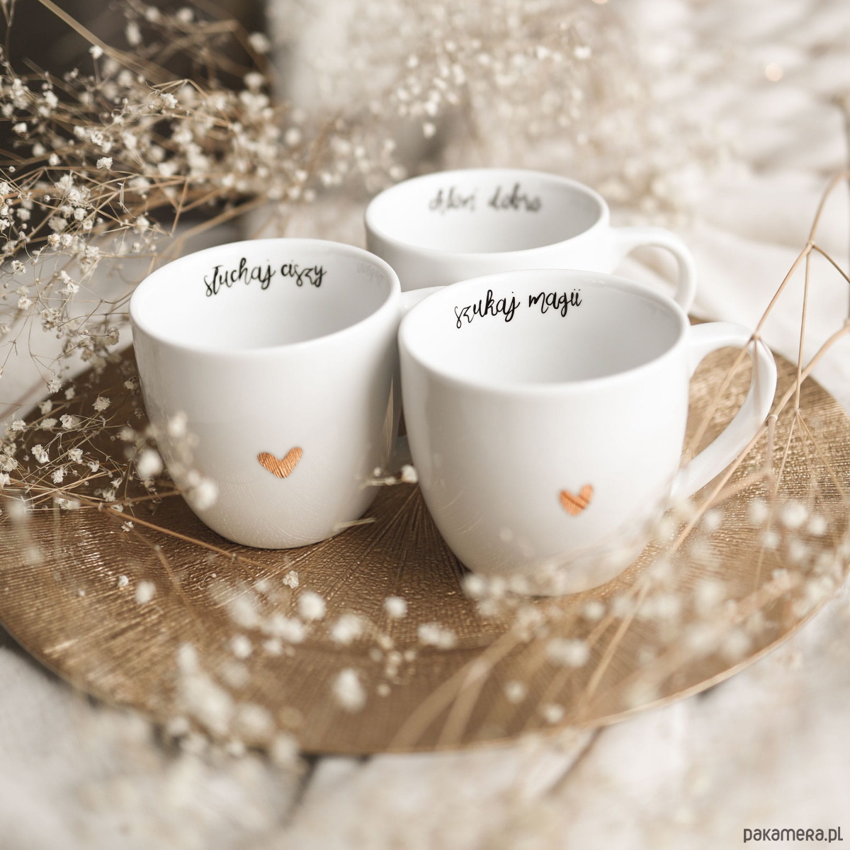Zestaw kubków zdobionych złotem - chłoń dobro, słuchaj ciszy, szukaj magii