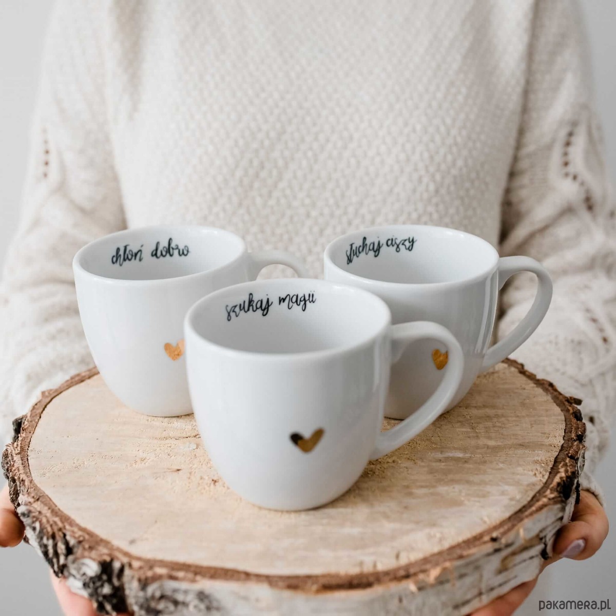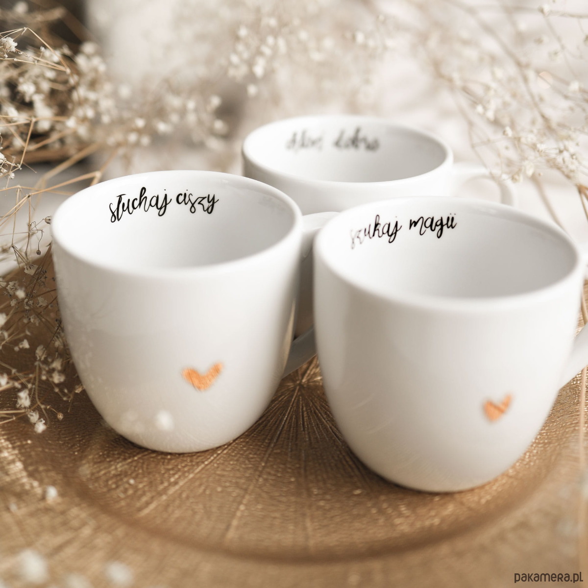 Zestaw 3 kubków porcelanowych zdobionych złotem: „chłoń dobro”, „słuchaj ciszy”, „szukaj magii”