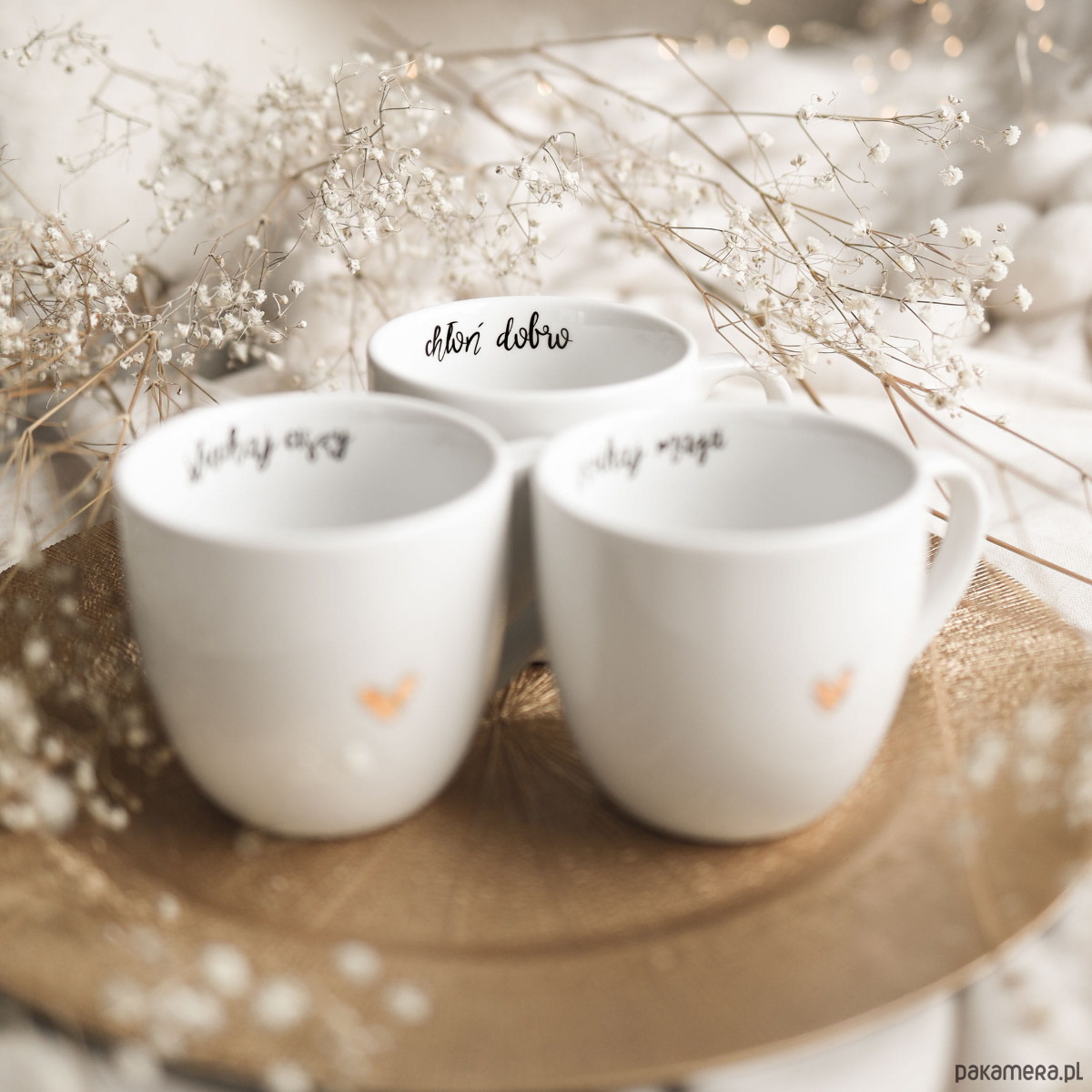 Rozpal iskierkę radości, dobra i wyciszenia, sięgając po wyjątkowe kubki porcelanowe. Ręcznie zdobione napisy niosą prosty przekaz, który inspiruje i motywuje do odgonienia czarnych myśli i skupieniu się na doświadczaniu szczęścia.